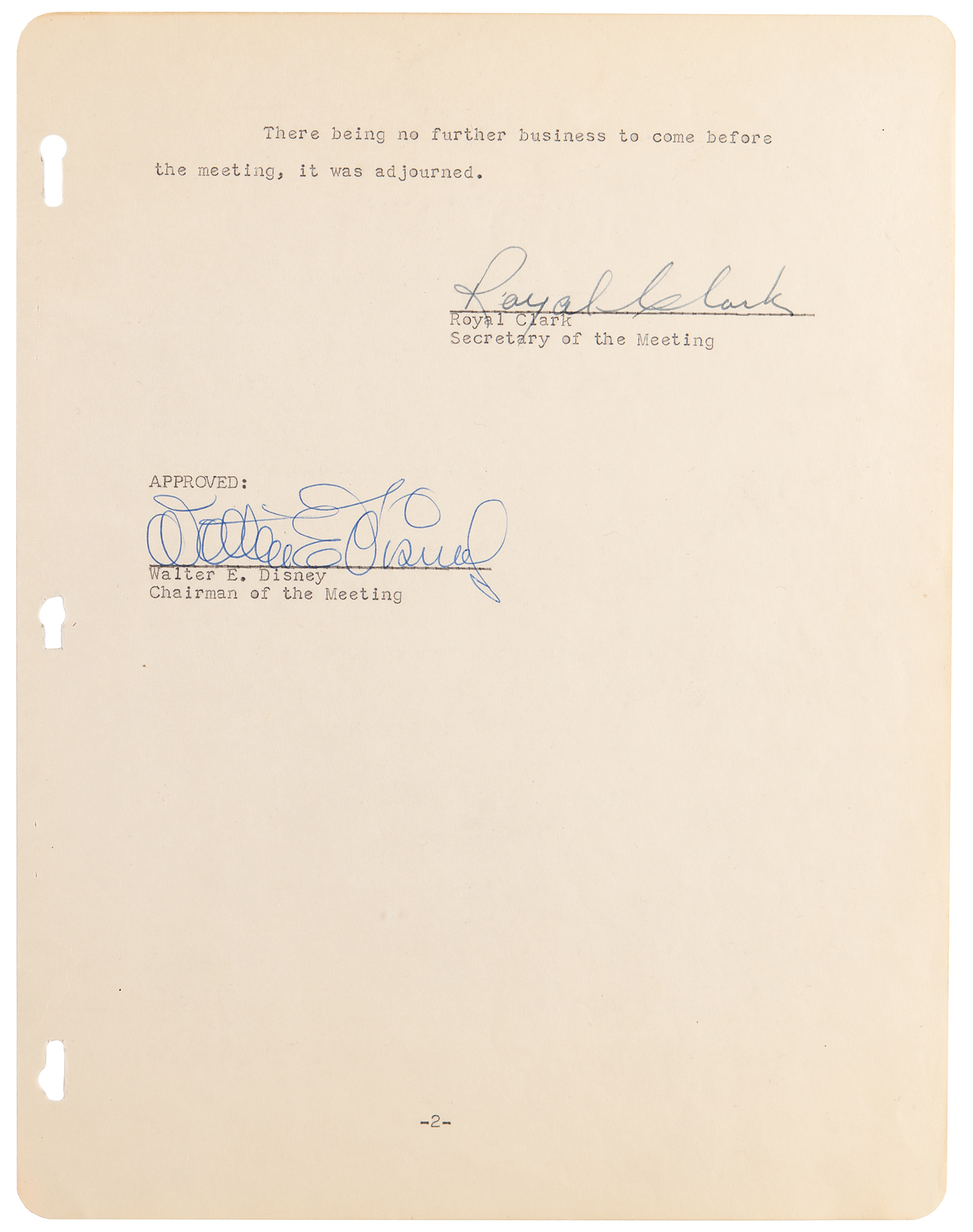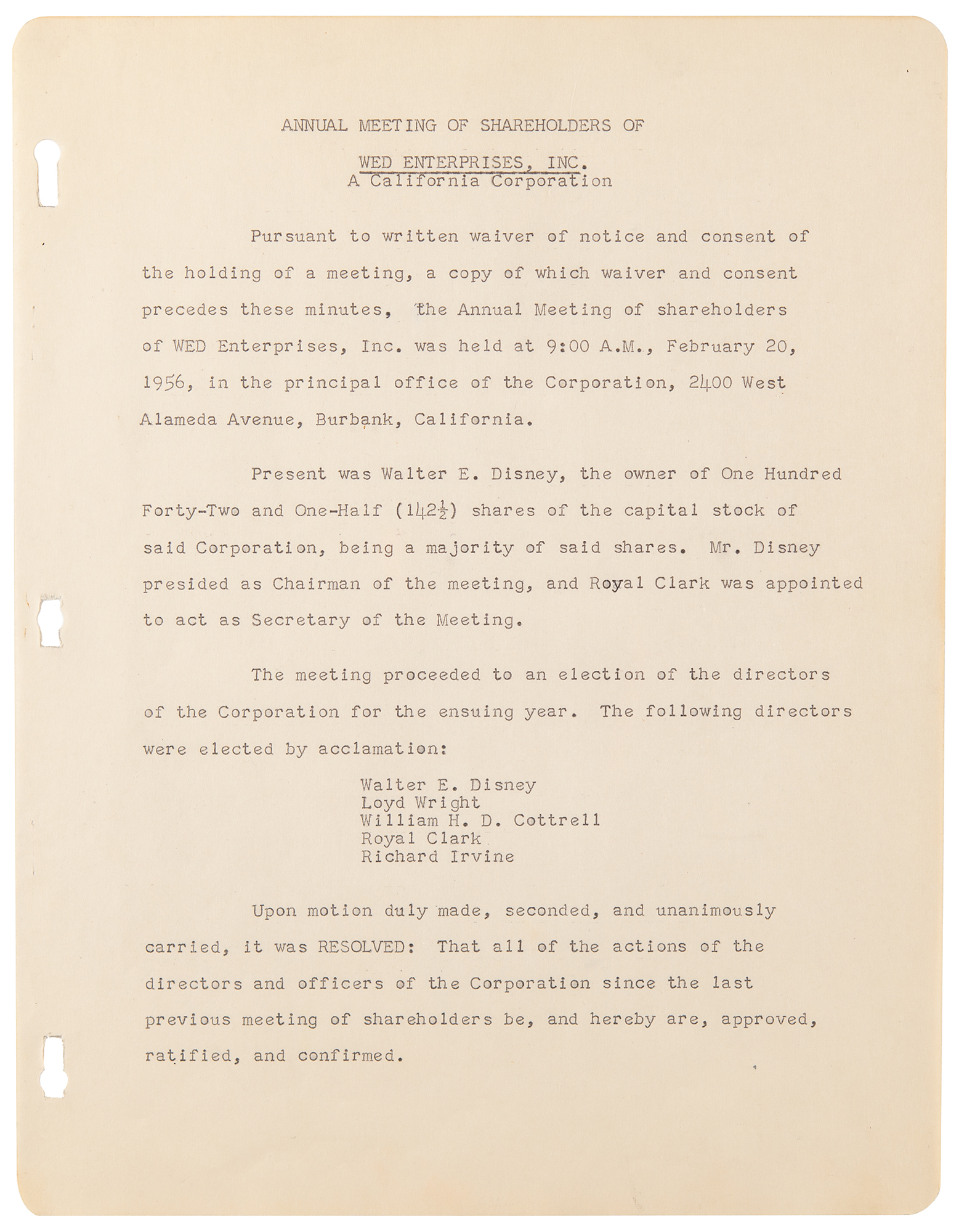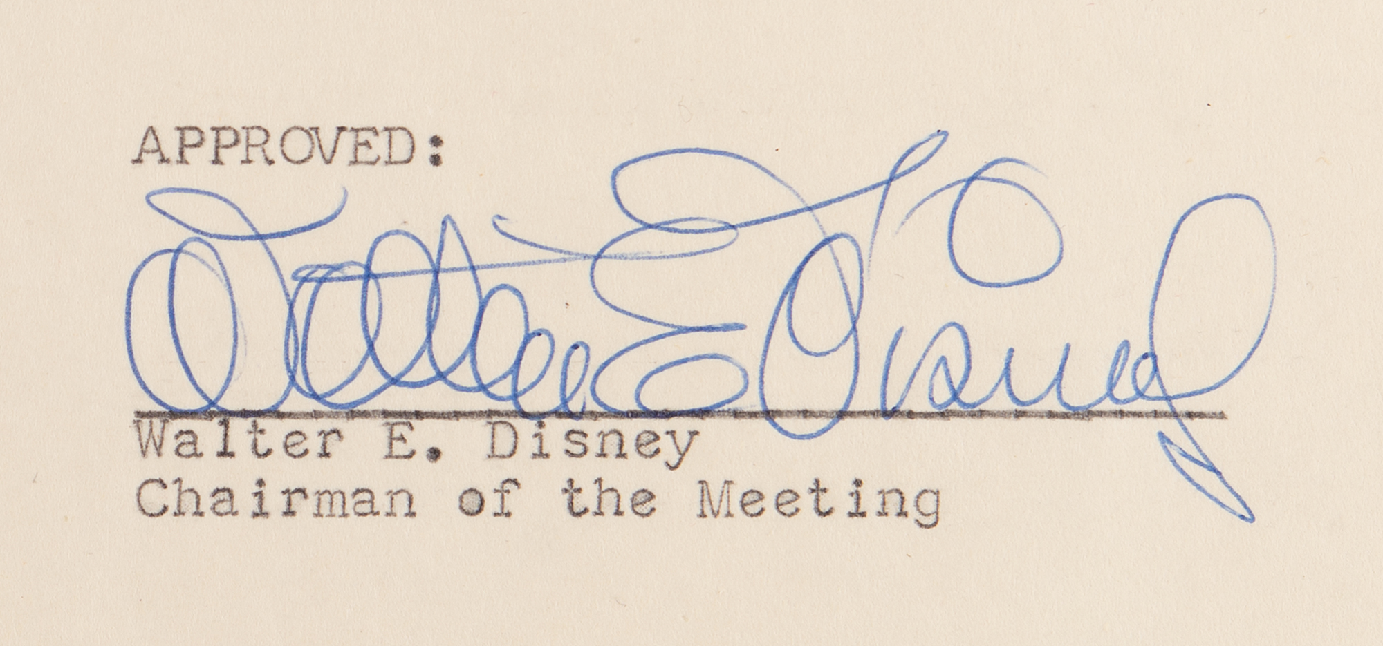 DS, signed “Walter E. Disney,” two pages, 8.5 x 11, February 20, 1956. Document related to an “Annual Meeting of shareholders of WED Enterprises, Inc.,” held on February 20, 1956, confirming the unanimous “election of the directors of the Corporation for the ensuing year,” which includes Walter E. Disney, Loyd Wright, William H. D. Cottrell, Royal Clark, and Richard Irvine. Signed neatly at the conclusion in blue ink by Disney as ‘Chairman of the Meeting,’ and countersigned by Clark as the meeting’s secretary. In fine condition. Accompanied by a full letter of authenticity from PSA/DNA.