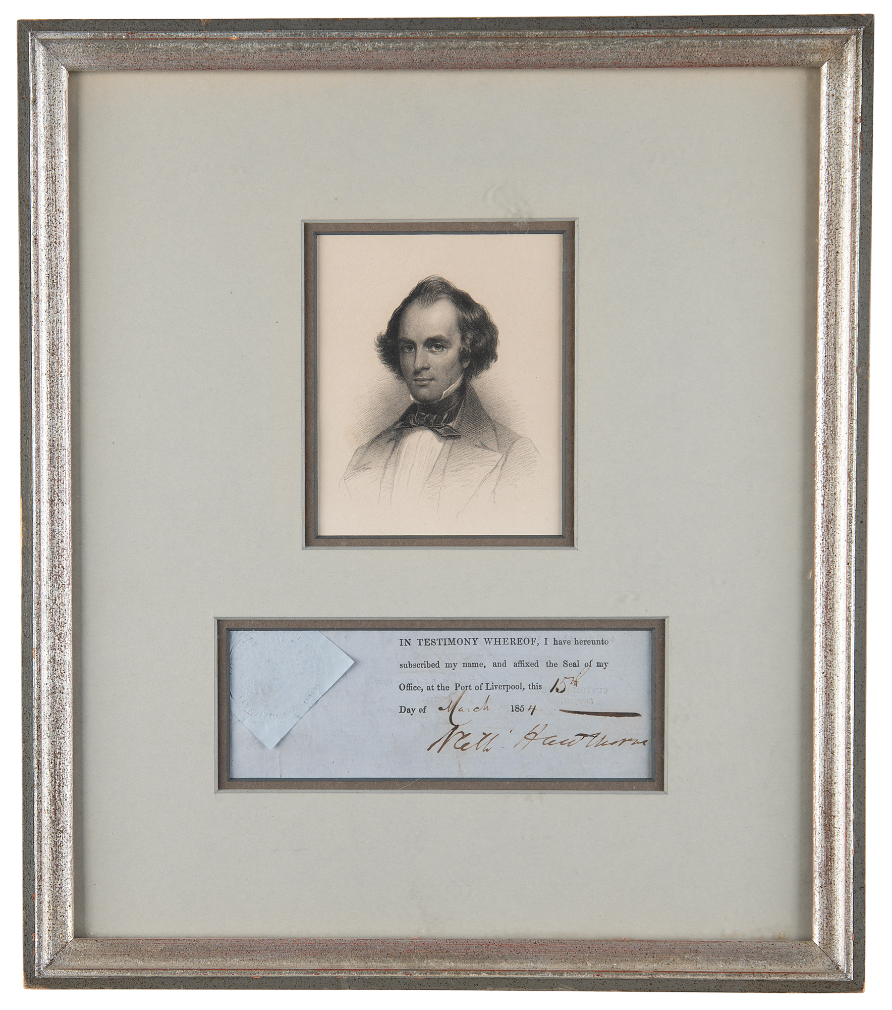 Partly-printed DS, signed “Nath. Hawthorne,” one page, 5.5 x 2, March 15, 1854. Conclusion of an official document issued at the Port of Liverpool, signed at the conclusion in ink by Hawthorne. Attractively double-matted and framed with a portrait to an overall size of 11 x 12.75. In fine condition.