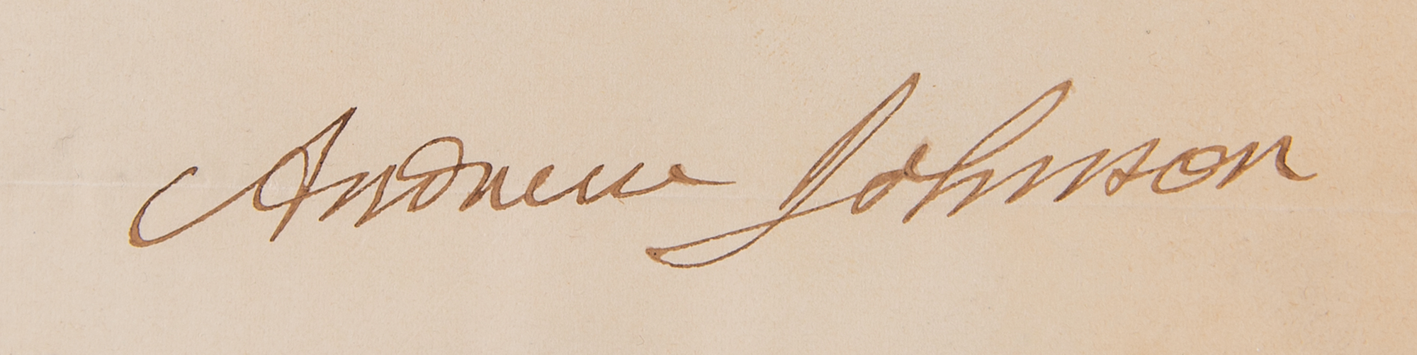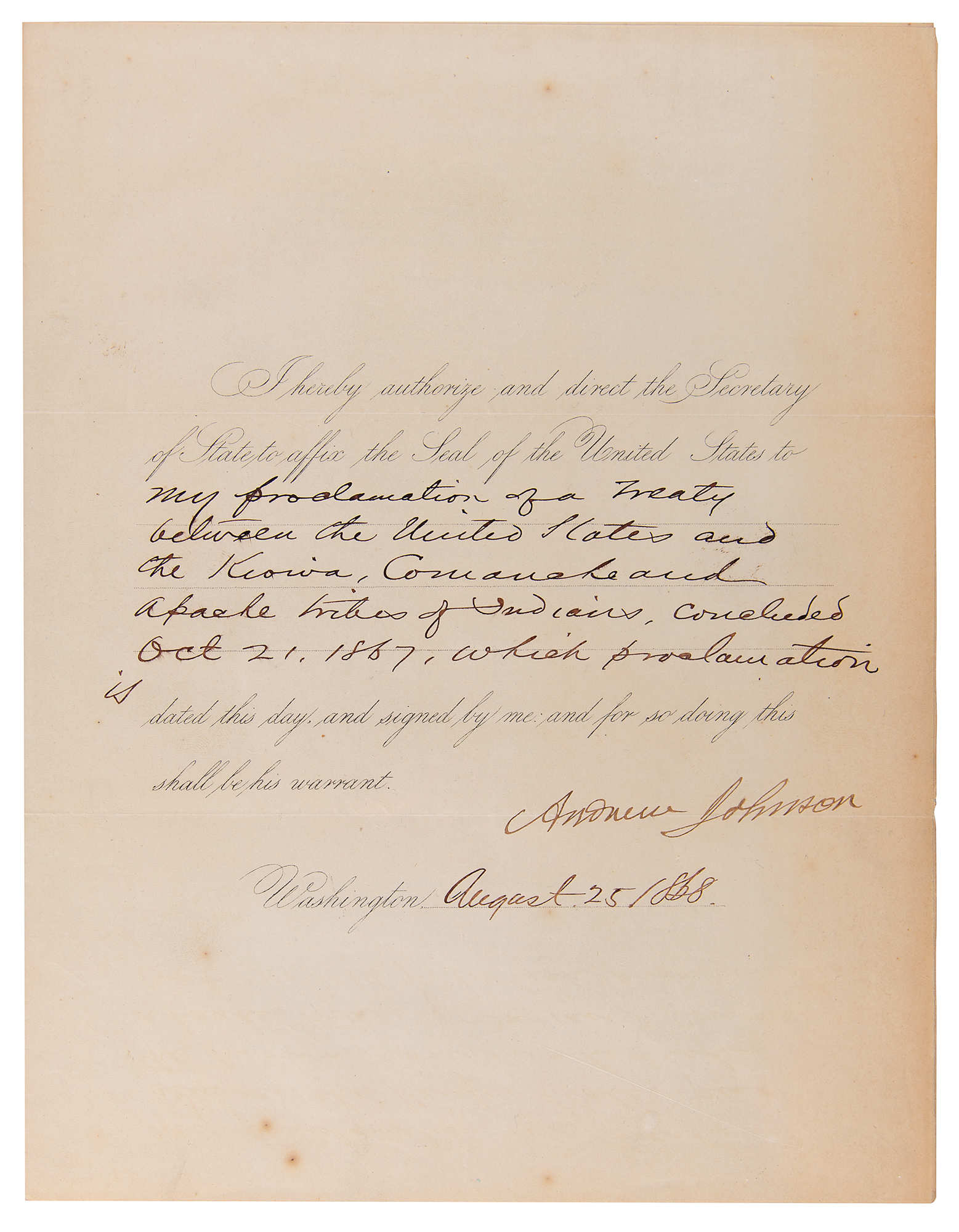 Partly-printed DS as president, one page, 8.5 x 11, August 25, 1868. President Johnson directs the Secretary of State to “affix the Seal of the United States to my proclamation of a Treaty between the United States and the Kiowa, Comanche and Apache tribes of Indians, concluded Oct. 21, 1867.” Signed neatly at the conclusion by Andrew Johnson. The document is affixed by its left edge inside a presentation folder that also contains a printed copy of the ‘Treaty with Kiowa and Comanche, 1867.’ In fine condition, with a bit of scattered foxing.