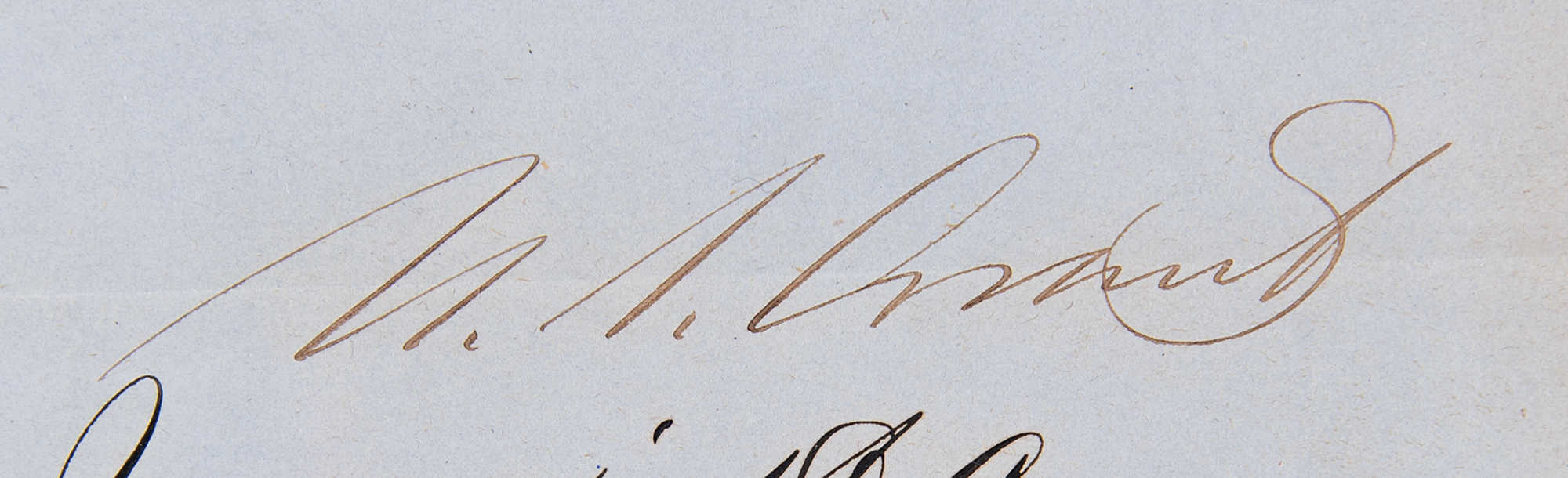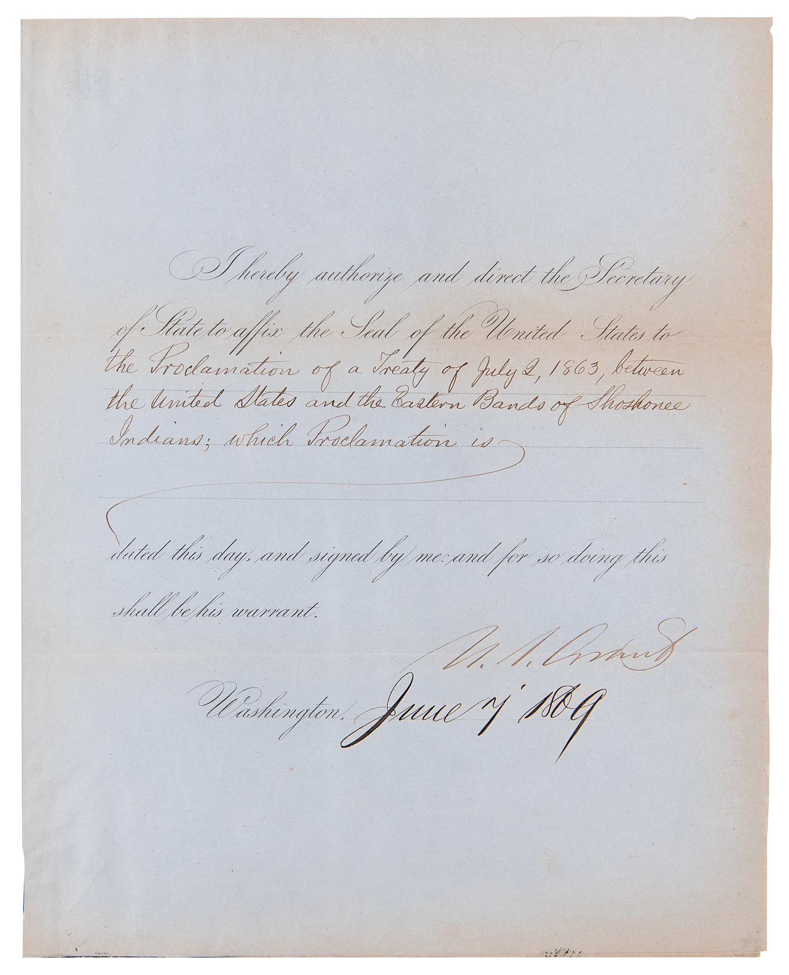 Partly-printed DS as president, one page, 8 x 10, June 7, 1869. President Grant directs the Secretary of State to “affix the Seal of the United States to the Proclamation of a Treaty of July 2, 1863, between the United States and the Eastern Bands of Shoshonee Indians.” Signed neatly at the conclusion by U. S. Grant. The document is affixed by its left edge inside a presentation folder that also contains a printed copy of the ‘Treaty with Eastern Shoshoni, 1863.” In fine condition, with light toning to the folds and edges.
