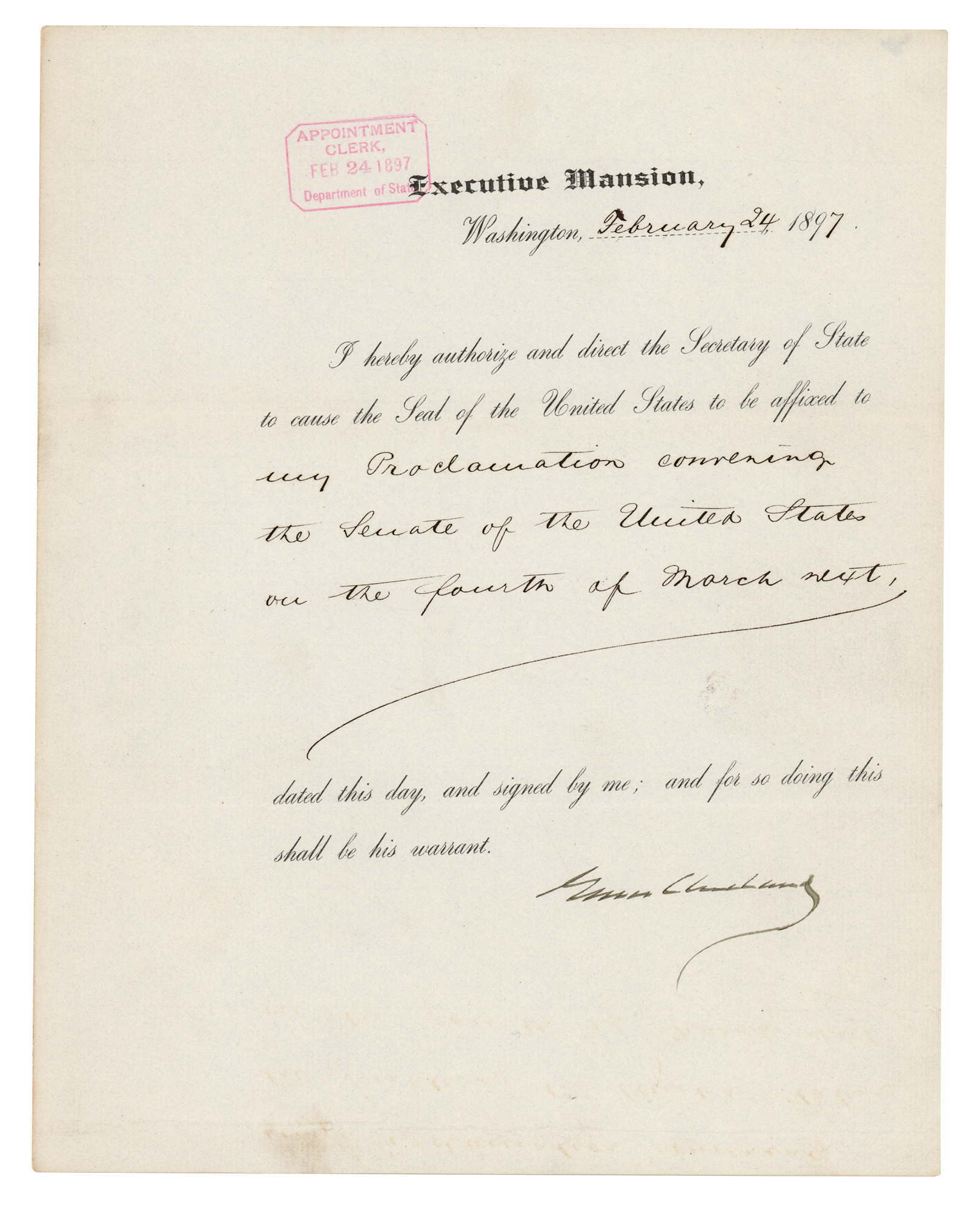 Partly-printed DS as president, one page, 8 x 10, February 24, 1897. President Cleveland directs the Secretary of State to “cause the Seal of the United States to be affixed to my Proclamation convening the Senate of the United States on the fourth of March next.” Signed neatly at the conclusion by Grover Cleveland. In fine condition.