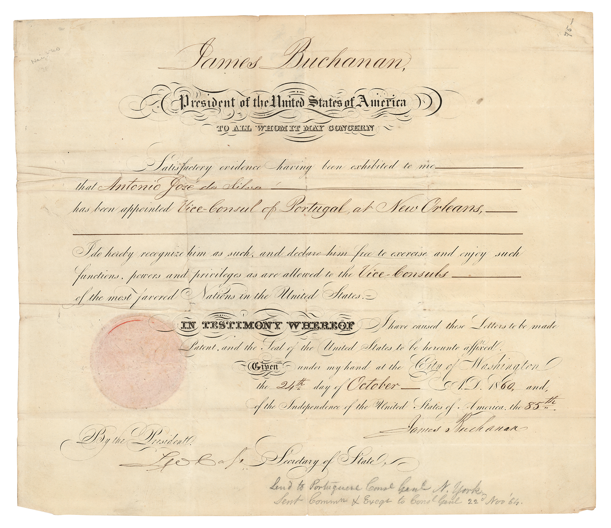 Partly-printed DS as president, one page, 15 x 13, October 24, 1860. President Buchanan appoints Antonio Jose da Silva as “Vice-Consul of Portugal, at New Orleans.” Signed neatly at the conclusion by James Buchanan and countersigned by Secretary of State Lewis Cass. The lower left is embossed with the official seal. In very good condition, with overall creasing and multiple intersecting folds. In 1860, New Orleans was one of the greatest ports in the world, with 33 different steamship lines and trade worth 500 million dollars passing through the city.