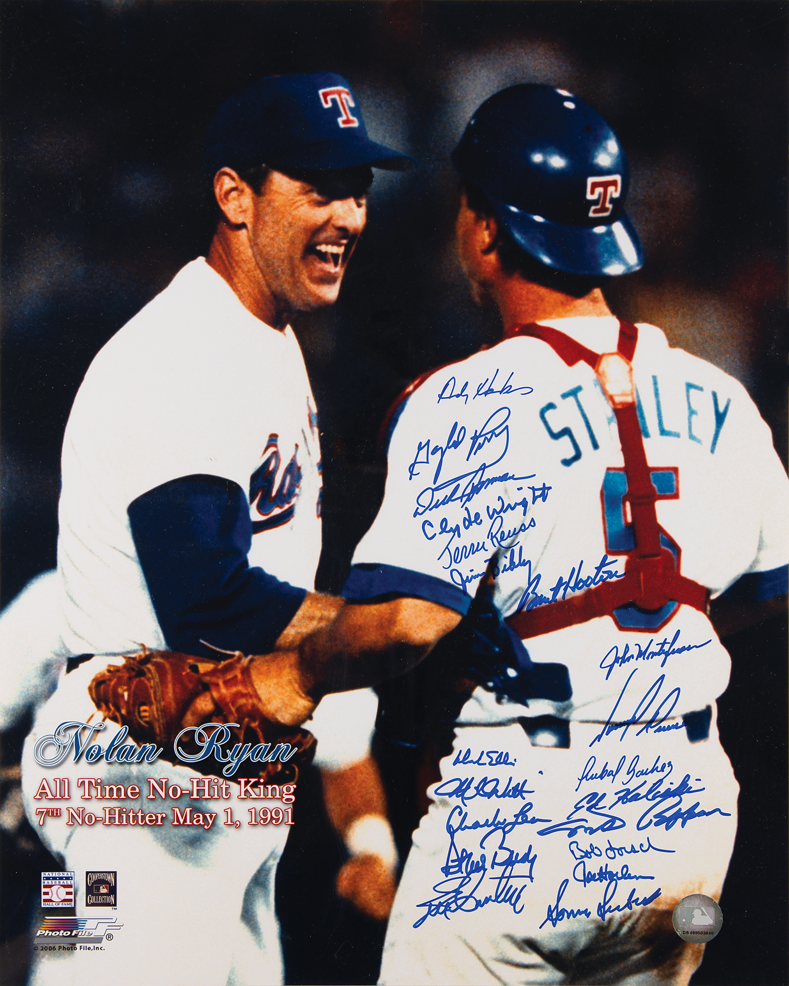 Color satin-finish 16 x 20 photo honoring Nolan Ryan as the 'All-Time No-Hit King,' signed in blue felt tip by 20 Major League Baseball pitchers who have thrown no-hitters: Jim Bibby, Dick Bosman, Steve Busby, Joe Cowley, Dock Ellis, Bob Forsch, Tommy Greene, Ed Halicki, Andy Hawkins, Burt Hooten, Joe Horlen, Charlie Lea, John Montefusco, Milt Pappas, Gaylord Perry, Jerry Ruess, Anibal Sanchez, Sonny Siebert, Mike Witt, and Clyde Wright. The lower right corner bears an MLB hologram label. In fine condition.