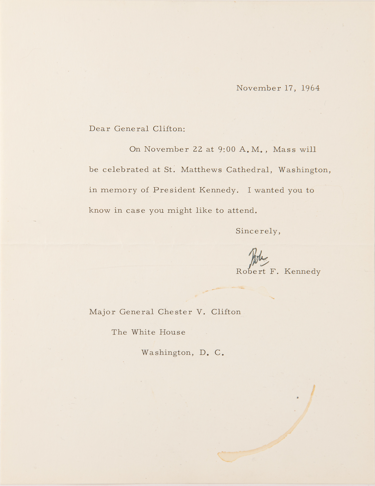 TLS signed “Robert,” one page, 7 x 9, November 17, 1964. Letter to Major General Chester V. Clifton, in full: “On November 22 at 9:00 A.M., Mass will be celebrated at St. Matthews Cathedral, Washington, in memory of President Kennedy. I wanted you to know in case you might like to attend.” In fine condition, with a coffee cup stain to the lower blank area. Chester Victor Clifton, Jr. (1913-1991) was a major general in the United States Army and a military aide to Presidents John F. Kennedy and Lyndon B. Johnson. Accompanied by the original mailing envelope.