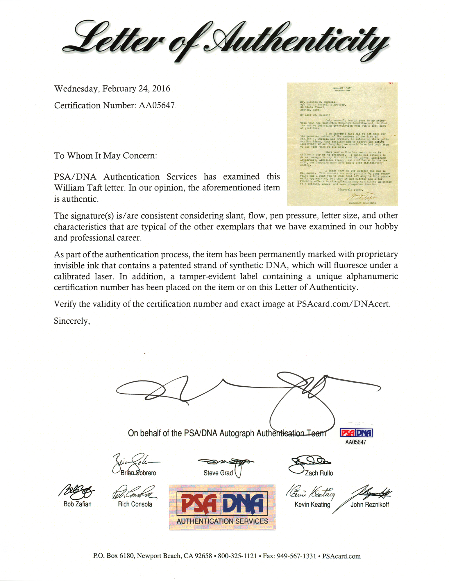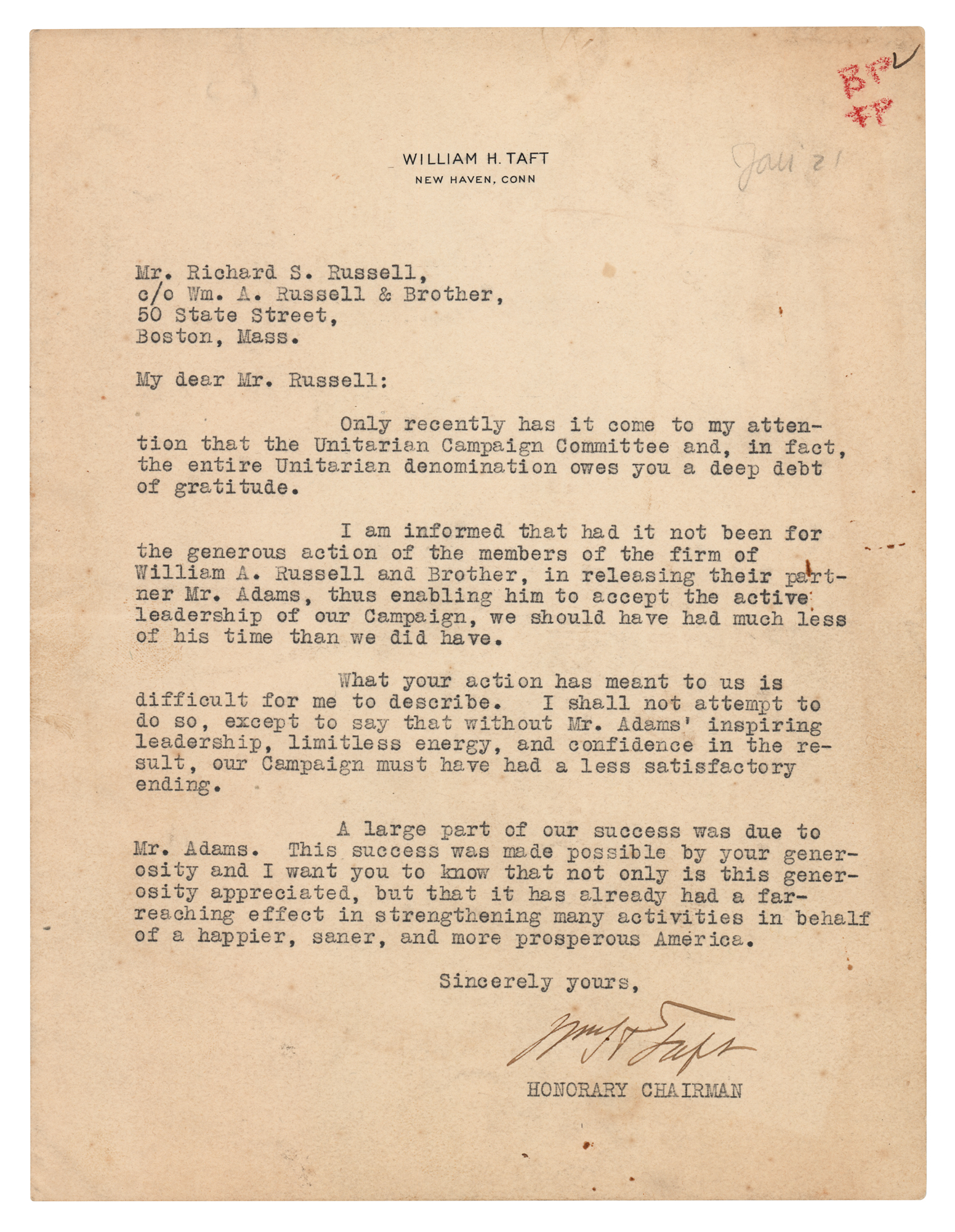 TLS signed “Wm. H. Taft,” one page, 7 x 9.25, personal letterhead, no date. Letter to Richard S. Russell, in full: “Only recently has it come to my attention that the Unitarian Campaign Committee and, in fact, the entire Unitarian denomination owes you a deep debt of gratitude. I am informed that had it not been for the generous action of the members of the firm of William A. Russell and Brother, in releasing their partner Mr. Adams, thus enabling him to accept the active leadership of our Campaign, we should have had much less of his time than we did have. What your action has meant to us is difficult for me to describe. I shall not attempt to do so, except to say that without Mr. Adams' inspiring leadership, limitless energy, and confidence in the result, our Campaign must have had a less satisfactory ending. A large part of our success was due to Mr. Adams. This success was made possible by your generosity and I want you to know that not only is this generosity appreciated, but that it has already had a far-reaching effect in strengthening many activities in behalf of a happier, saner, and more prosperous America.” Taft signs at the conclusion as "Honorary Chairman." In fine condition, with scattered light foxing and soiling. Accompanied by a full letter of authenticity from PSA/DNA.