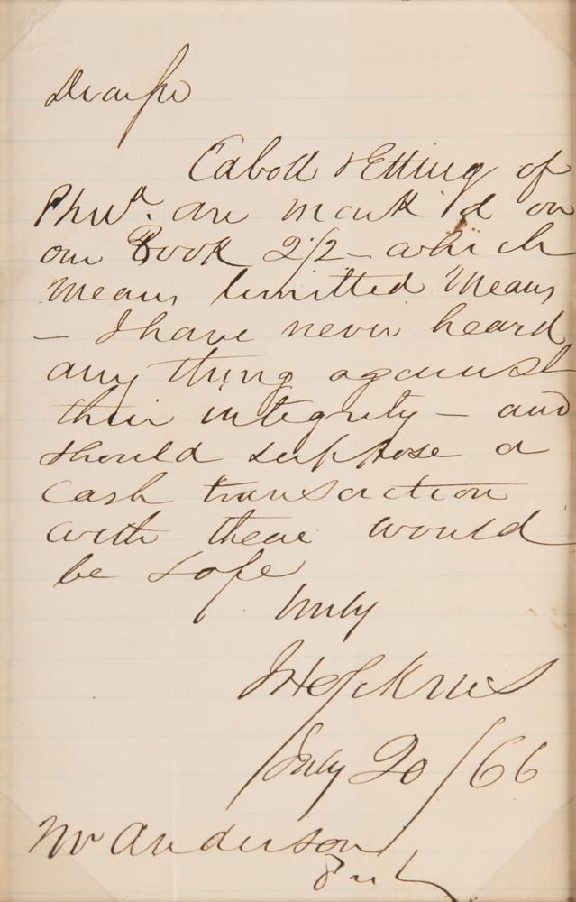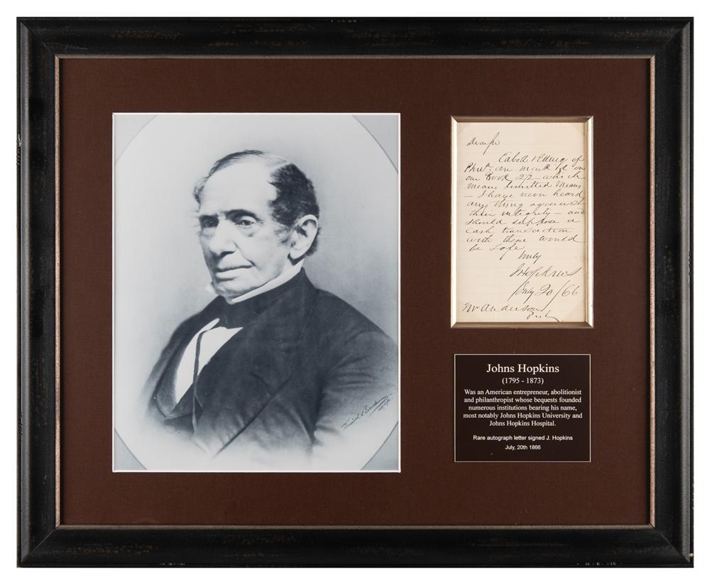 American entrepreneur, abolitionist, and philanthropist (1795-1873) whose legacy lives on in numerous foundations and institutions, such as Johns Hopkins Hospital and Johns Hopkins University. ALS signed “J. Hopkins,” one page, 4.75 x 7.25, July 20, 1866. Handwritten letter to "Mr. Anderson," in full: "Cabott & Etting of Phil'a are mark'd on our Book 2/2—which means limited means—I have never heard any thing against their integrity—and should suppose a cash transaction with them would be safe." Cloth-matted and framed with a portrait and plaque to an overall size of 25 x 20. In fine condition.