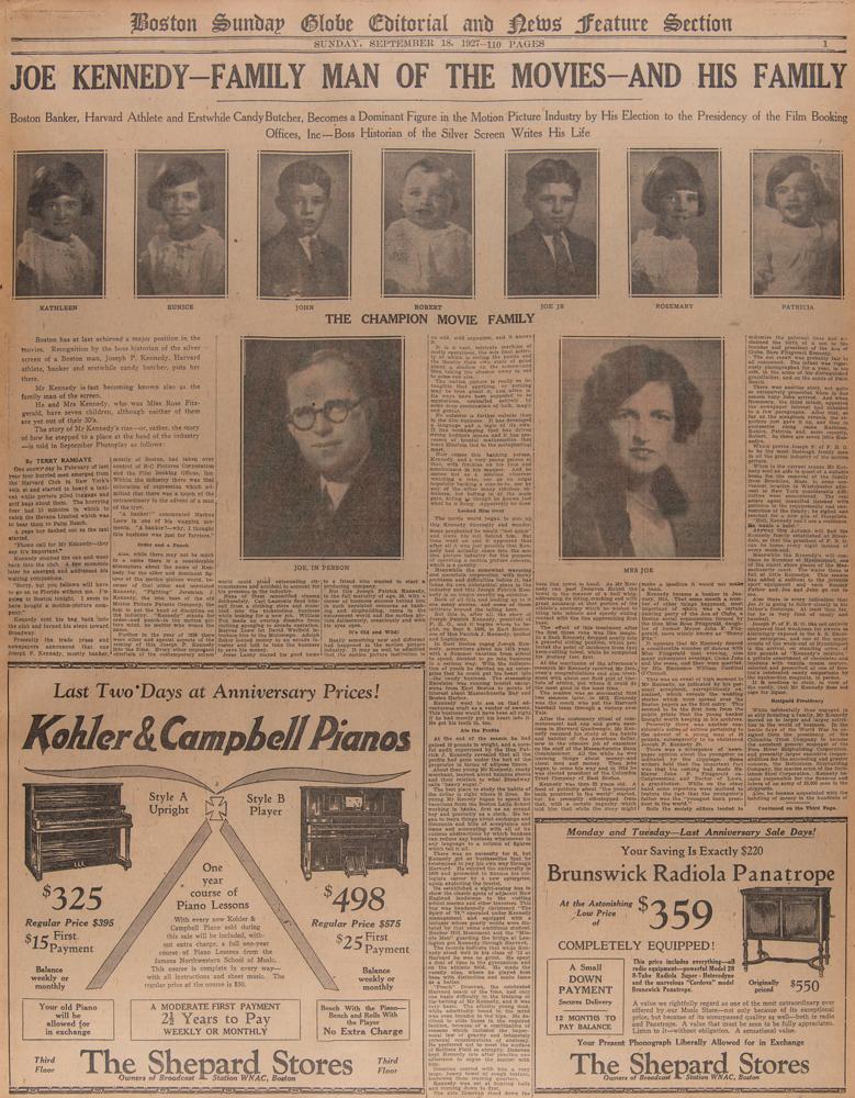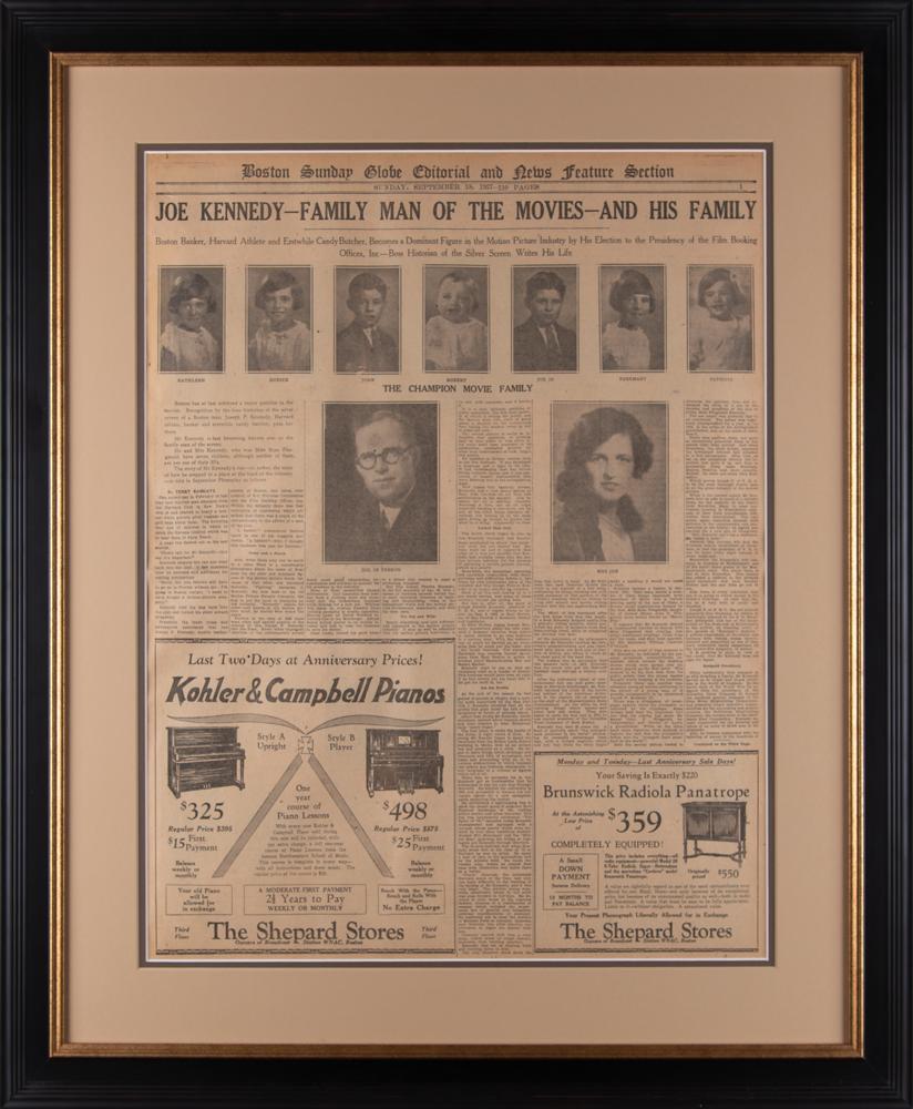 First page of the "Boston Sunday Globe Editorial and News Feature Section" from September 18, 1927, 17.5 x 22.5, featuring a story on the up-and-coming Kennedy family, headlined: "Joe Kennedy—Family Man of the Movies—And His Family." The subhead reads: "Boston Banker, Harvard Athlete and Erstwhile Candy Butcher, Becomes a Dominant Figure in the Motion Picture Industry by His Election to the Presidency of the Film Booking Offices, Inc.—Boss Historian of the Silver Screen Writes His Life." The story features images of Joseph P. Kennedy, Sr., his wife, Rose, and their then-seven children: Kathleen, Eunice, John, Robert, Joe Jr., Rosemary, and Patricia. Archivally double-matted and framed to an overall size of 25.5 x 30.75. In fine condition.