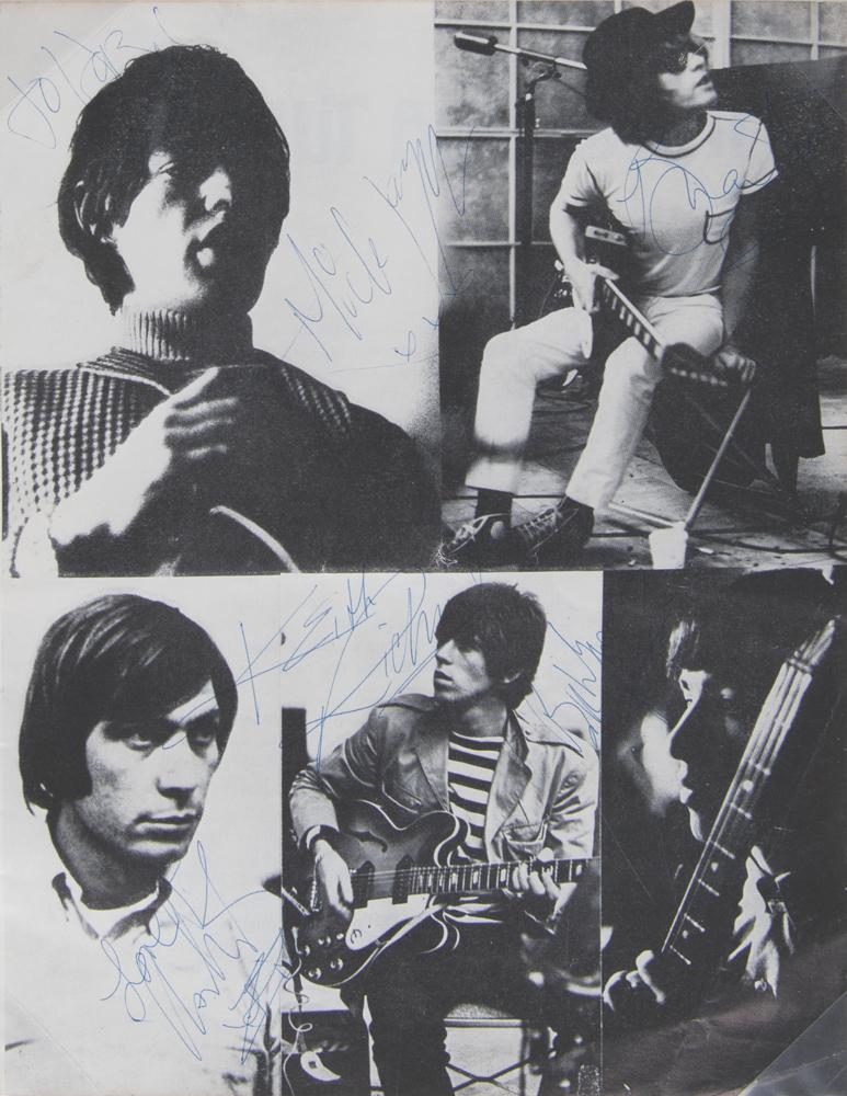 Fabulous vintage 8 x 10.25 composite magazine photo of the Rolling Stones, signed in blue ballpoint by Mick Jagger (adding an inscription to "Hazel"), Keith Richards, Brian Jones, Bill Wyman, and Charlie Watts. Corner-mounted, double-matted, and framed with a plaque to an overall size of 15 x 21. In very good to fine condition, with creasing to the lower right corner. Accompanied by a full letter of authenticity from PSA/DNA.