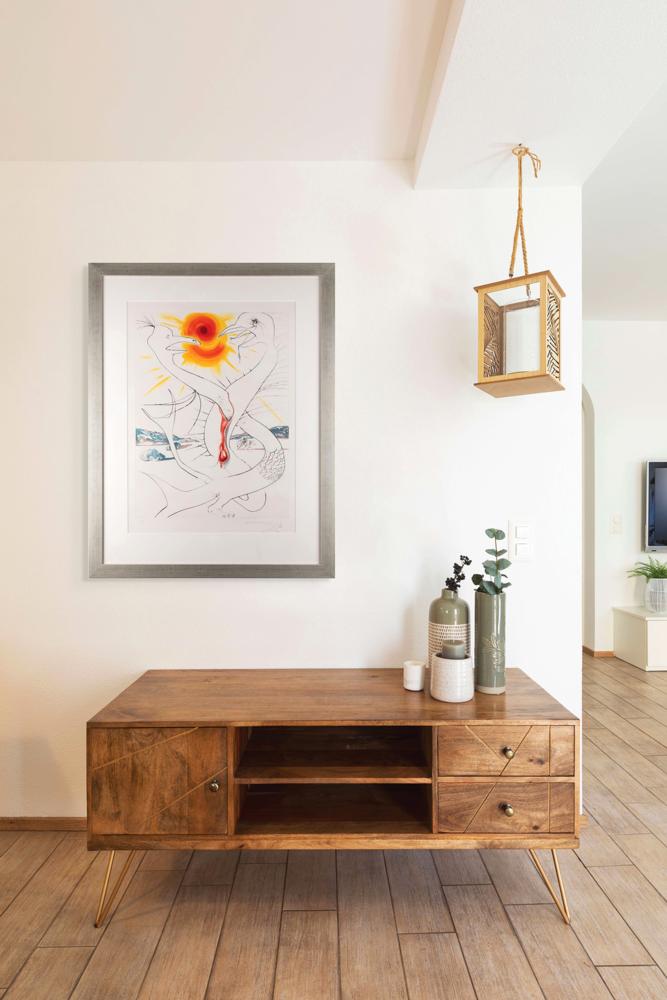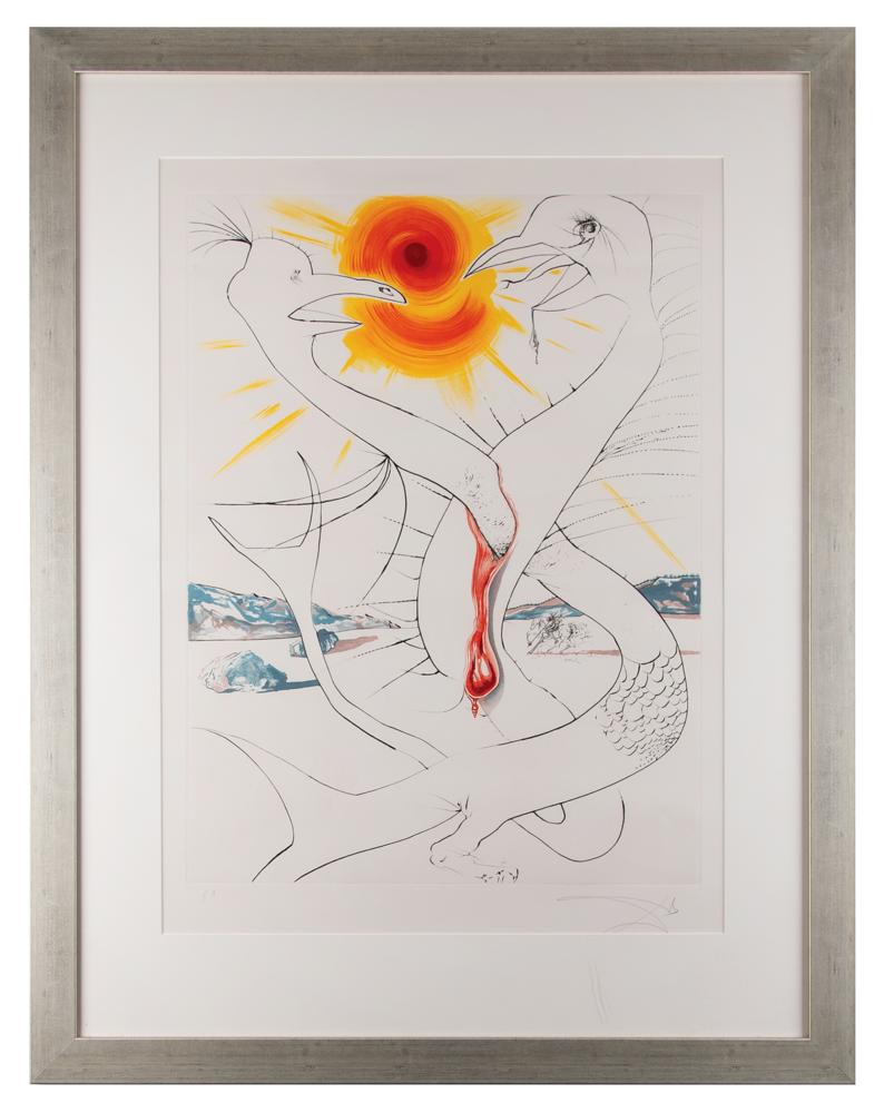 Handsome color limited edition 24 x 33 drypoint etching over chromolithograph entitled 'La Caducée de Mars alimenté par la boule de feu de Jupiter [The Caduceus of Mars Nourished by Jupiter’s Ball of Fire], marked "E.A." (épreuve d'artiste, or artist's proof) in the lower left, signed in the lower border in pencil by the artist, "Dali." Handsomely matted and framed to an overall size of 35 x 45. In very fine condition. A highly attractive, oversized piece signed by the surrealist master.