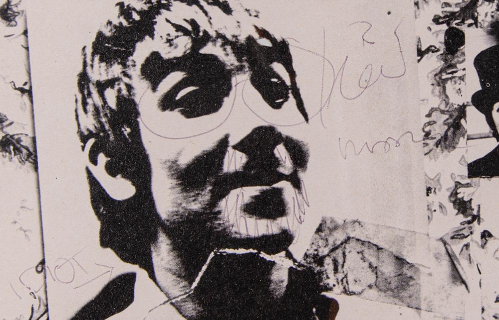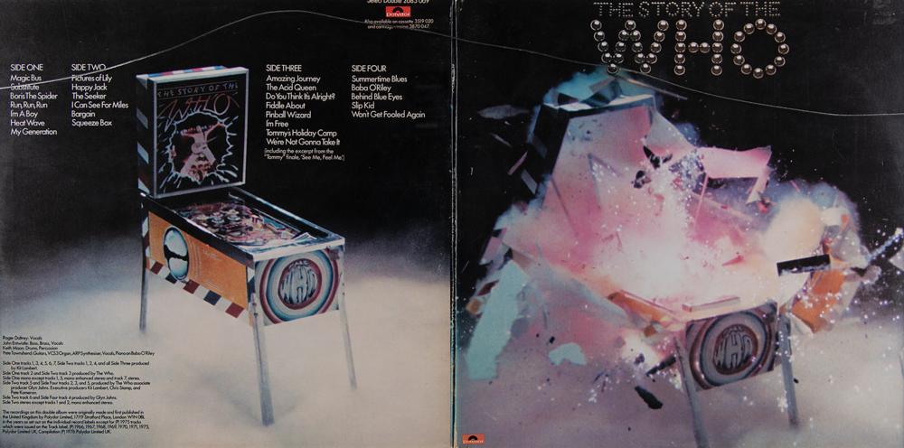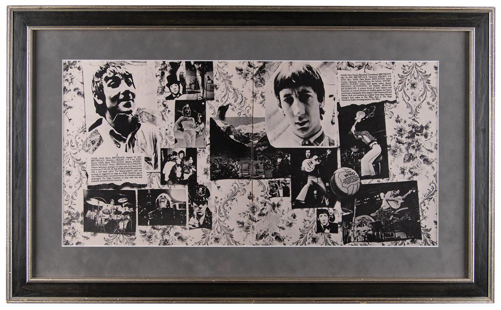 The Story of the Who album insert booklet signed next to his portrait in ballpoint, "Keith Moon," adding the word "idiot" along with several doodles on his face—including glasses and a goatee. Matted and framed with glass on both sides to an overall size of 30 x 18. In fine condition. The record is not included.