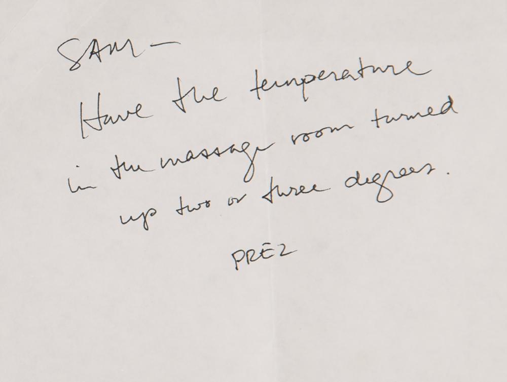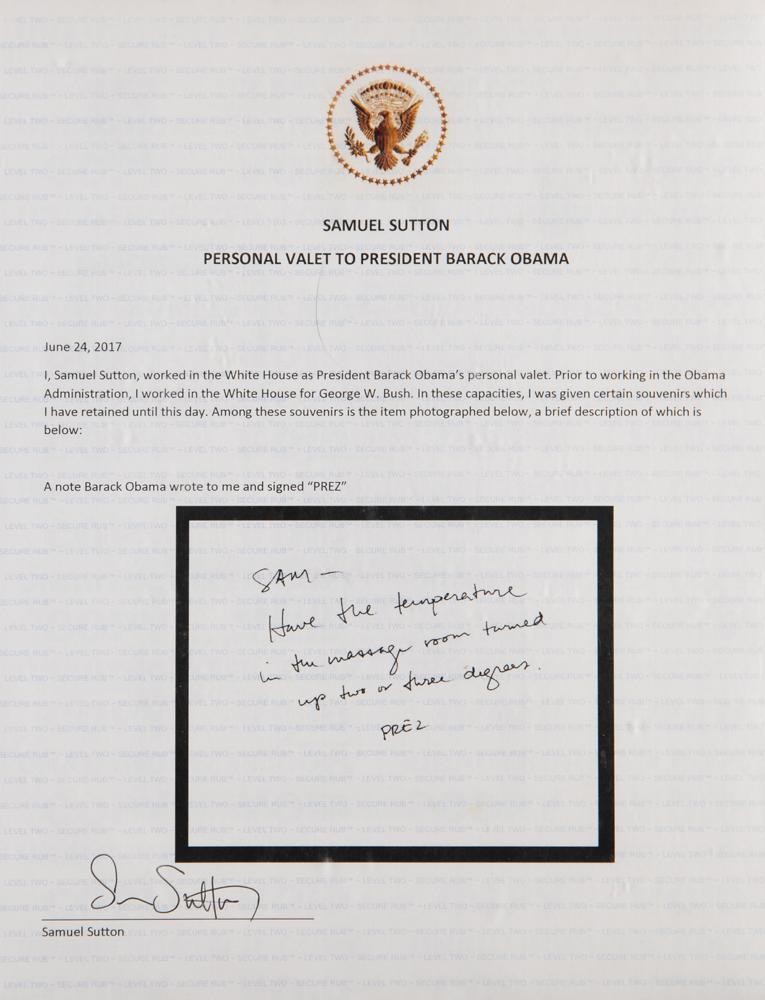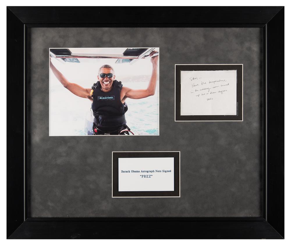 ANS as president, signed "Prez," on a white 5 x 4 slip, no date. Handwritten note to his personal valet, Samuel Sutton, in full: "Sam—Have the temperature in the massage room turned up two or three degrees." Archivally corner-mounted, suede-matted, and framed with an image of a relaxed Obama to an overall size of 24.5 x 20.5. In fine condition, with a central vertical fold. Accompanied by a letter of provenance from Samuel Sutton, the personal valet to President Obama, in full: "I, Samuel Sutton, worked in the White House as President Barack Obama's personal valet. Prior to working in the Obama Administration, I worked in the White House for George W. Bush. In these capacities, I was given certain souvenirs which I have retained until this day. Among these souvenirs is the item photographed below, a brief description of which is below: A note Barack Obama wrote to me and signed 'Prez.'"