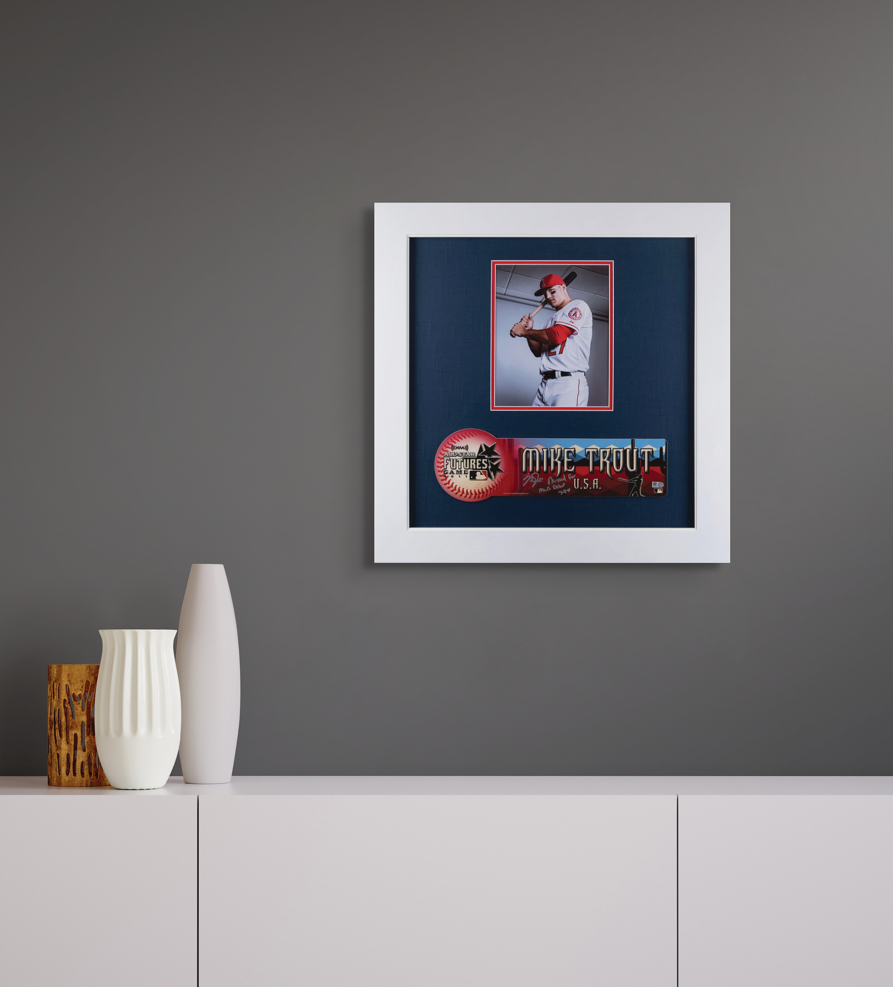 Mike Trout's locker tag name plate issued for the 2011 All-Star Futures Game, 15.75 x 5, signed in silver ink, "Mike Trout, Missed for MLB Debut, 7-8-11." Mounted with a photo of the 11-time All-Star to an overall size of 24 x 24.5. In very fine condition, with an MLB authentication hologram (VS197669) affixed to the lower right.