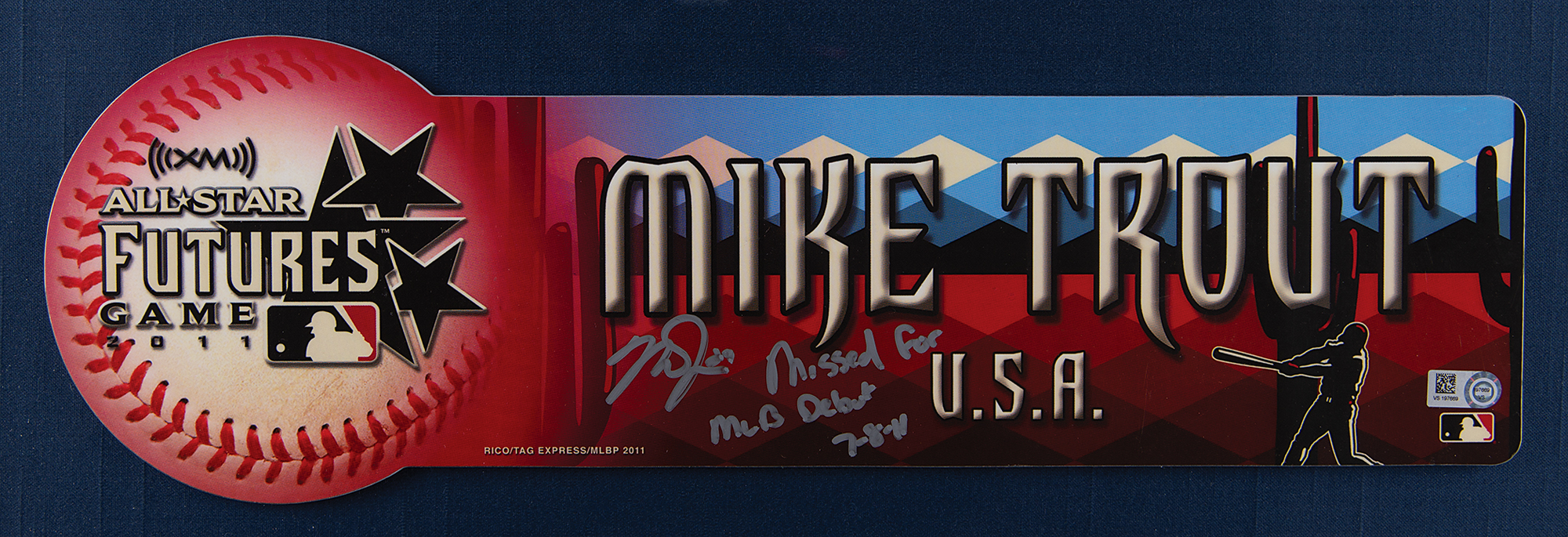 Mike Trout's locker tag name plate issued for the 2011 All-Star Futures Game, 15.75 x 5, signed in silver ink, "Mike Trout, Missed for MLB Debut, 7-8-11." Mounted with a photo of the 11-time All-Star to an overall size of 24 x 24.5. In very fine condition, with an MLB authentication hologram (VS197669) affixed to the lower right.
