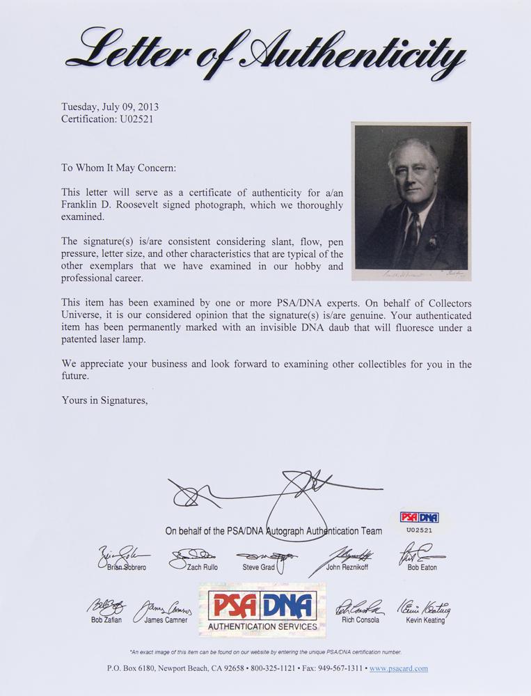 Vintage matte-finish 11.25 x 14.75 portrait of FDR by Pach Bros. of New York, neatly signed in the lower border in fountain pen, "Franklin D. Roosevelt." Handsomely cloth-matted and framed to an overall size of 20 x 24. In very fine condition. Accompanied by a full letter of authenticity from PSA/DNA. An exceptional, uncommonly large autographed image of the chief executive who capably steered the 'ship of state' through such crises as the Great Depression and World War II.