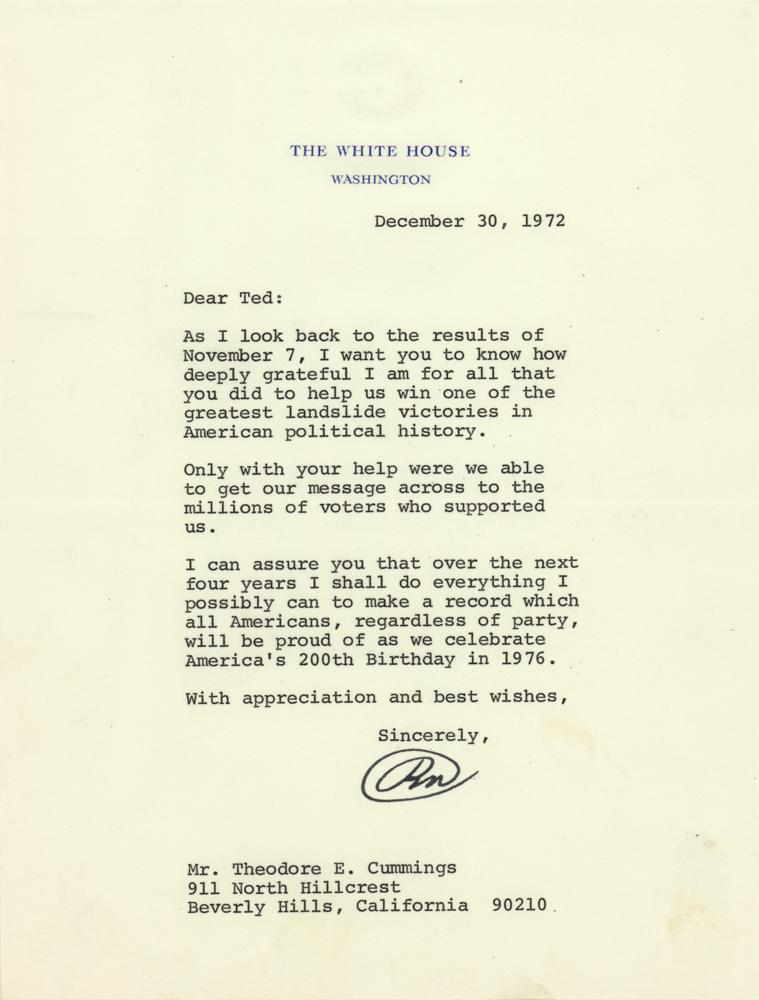 TLS as president signed “RN,” one page, 6.75 x 9, White House letterhead, December 30, 1972. Letter to Theodore E. Cummings, in full: "As I look back to the results of November 7, I want you to know how deeply grateful I am for all that you did to help us win one of the greatest landslide victories in American political history. Only with your help were we able to get our message across to the millions of voters who supported us. I can assure you that over the next four years I shall do everything I possibly can to make a record which all Americans, regardless of party, will be proud of as we celebrate America's 200th Birthday in 1976." In fine condition. Accompanied by a full letter of authenticity from JSA. President Nixon's closing line offers an interesting and seemingly sincere patriotic promise, but one which ultimately went unfulfilled—by the time of America's bicentennial celebration, Nixon had been forced to resign in disgrace and Gerald Ford was serving as president.