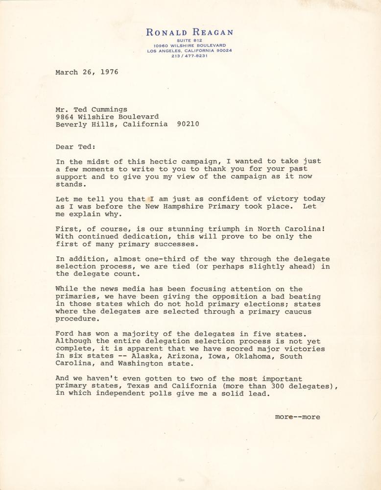 TLS signed “Ron,” two pages, 8.5 x 11, personal letterhead, March 26, 1976. Letter to Ted Cummings, a longtime friend and member of Reagan's 'Kitchen Cabinet.' In part: "In the midst of this hectic campaign, I wanted to take just a few moments to write to you to thank you for your past support and to give you my view of the campaign as it now stands. Let me tell you that I am just as confident of victory today as I was before the New Hampshire Primary took place. Let me explain why.