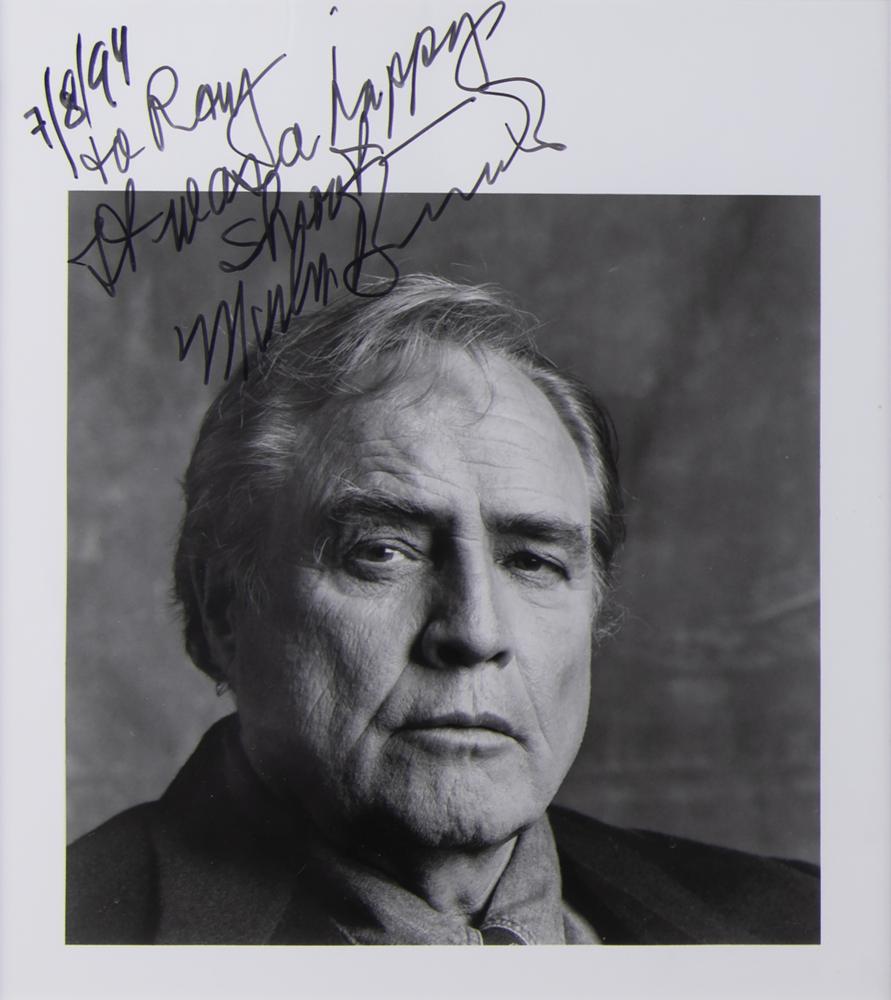 Satin-finish 7.75 x 8.75 close-up photo of an elder Brando staring into the camera, signed and inscribed in black felt tip, "To Ray, It was a happy shoot, Marlon Brando," who adds the date above, "7/8/94.” Archivally double-matted and framed to an overall size of 13.75 x 15. In very good to fine condition, with scattered light creasing.
