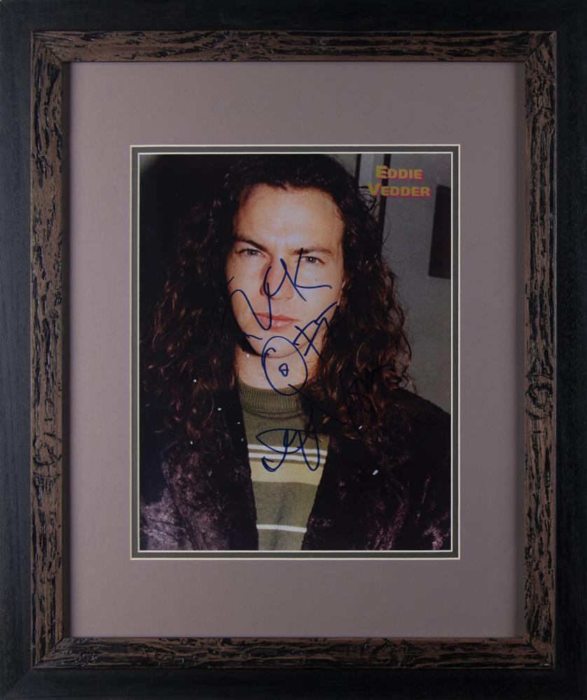 Excellent color glossy 10.5 x 13.5 close-up photo of the Pearl Jam singer from early in the band's career, signed in blue felt tip, "Fuck off. Eddie Vedder." Double-matted and framed to an overall size of 19.75 x 23.75. In fine condition. Accompanied by a full letter of authenticity from JSA.