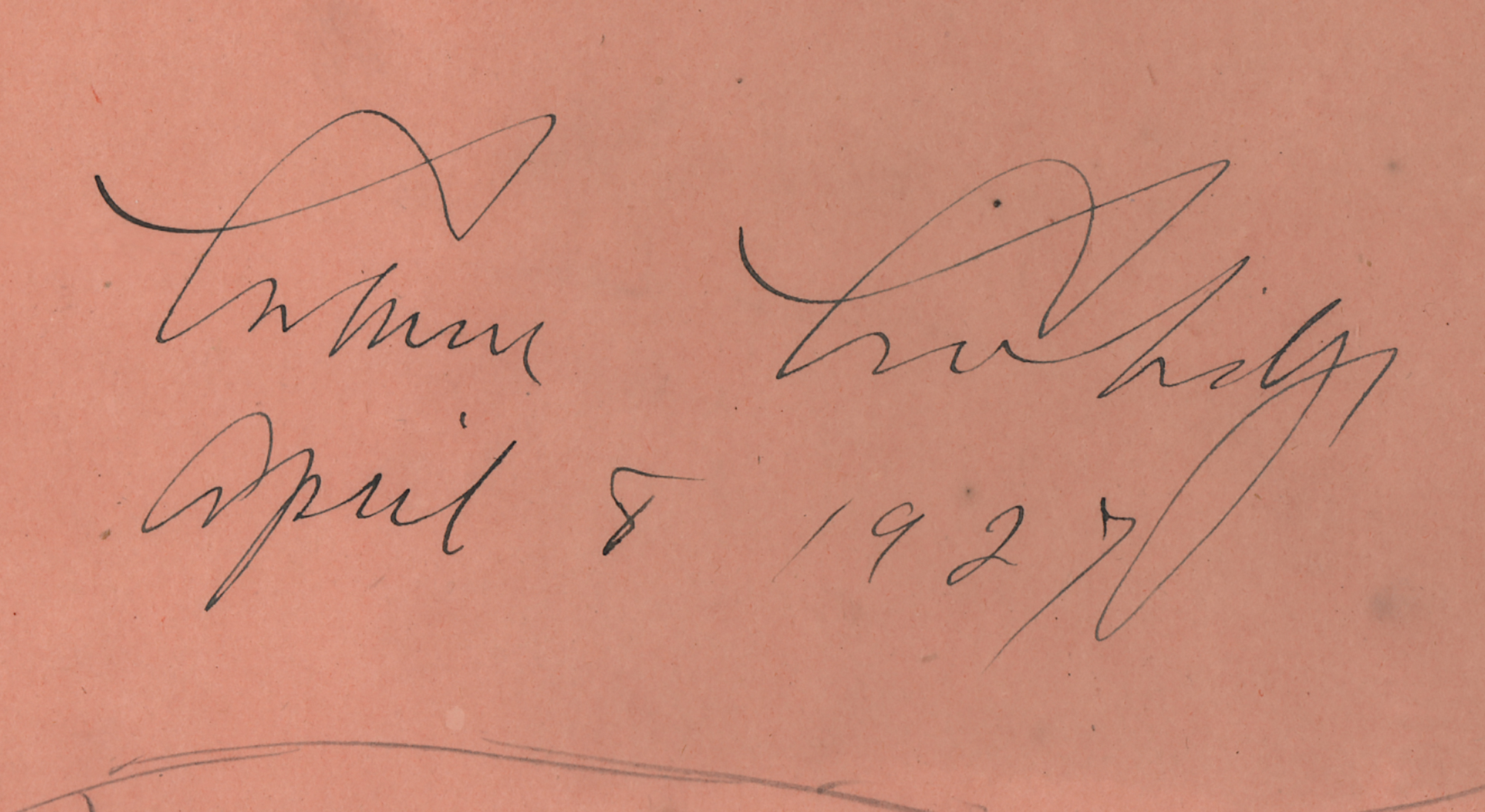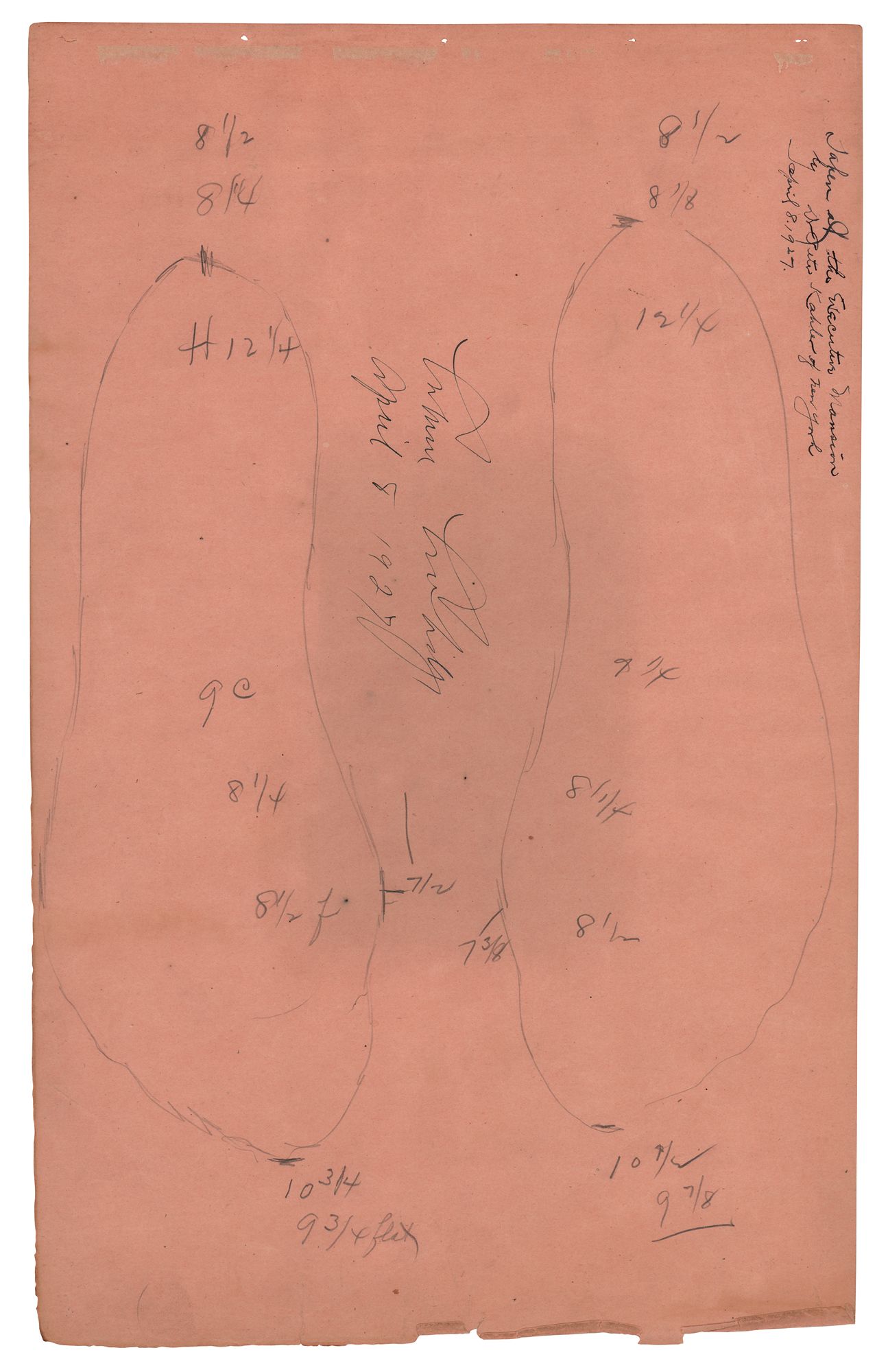 A unique presidential autograph—original pencil foot tracings of President Calvin Coolidge on a light pink 14.5 x 9 sheet, signed and dated at the center in ink as president, "Calvin Coolidge, April 8, 1927." Annotated in the upper left in ink: "Taken at the Executive Mansion by Dr. Peter Kahler of New York, April 8, 1927." The foot tracings are annotated with various pencil markings and measurements. In fine condition, with light edge wear.