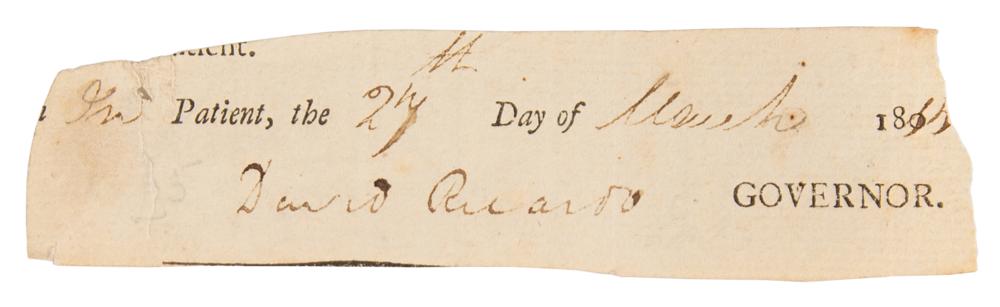 Extremely influential classical economist (1722-1823) known for developing the theory of comparative advantage. Scarce and desirable ink signature, "David Ricardo,” on an off-white 4.25 x 1 slip clipped from a larger document. In fine condition, with light soiling and a tiny hole to the upper left. A superb offering from one of the most profound and significant thinkers in classical economics.