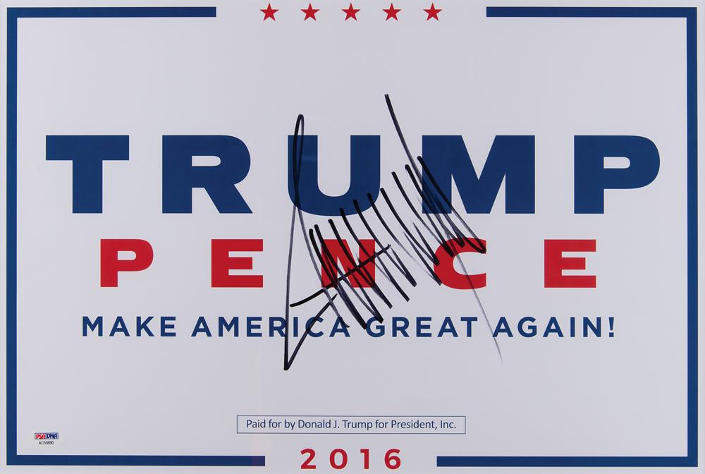 Original 18.5 x 12.5 presidential campaign sign from 2016, reading, "Trump / Pence: Make America Great Again!," prominently signed in black felt tip by Donald Trump. Archivally matted and framed to an overall size of 26.75 x 20.5. In fine condition, with a PSA/DNA label affixed to the lower corner. Accompanied by a certificate of authenticity from PSA/DNA.
