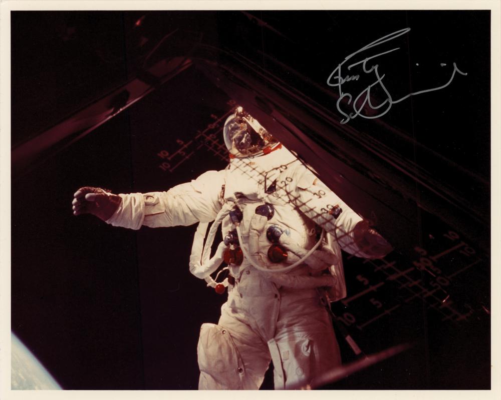 Color semi-glossy 10 x 8 photo of Rusty Schweickart performing a spacewalk during the Apollo 9 mission, signed in silver ink. In very fine condition.