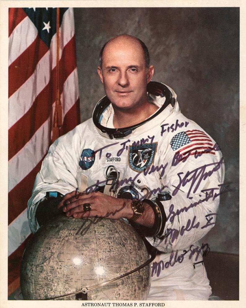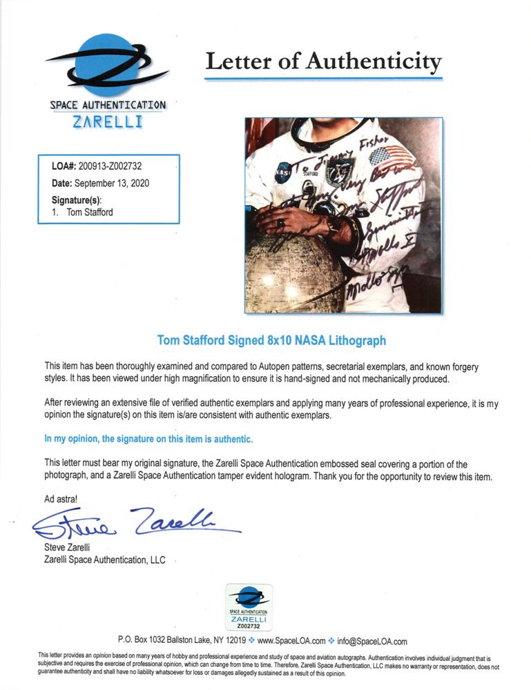 Official color 8 x 10 NASA lithograph of Stafford posing in his white space suit with a lunar globe, signed and inscribed in black felt tip, “To Jimmy Fisher, with my very best wishes, General Tom Stafford, Gemini VI, IX, Apollo X, Apollo-Soyuz.” In fine condition. Accompanied by a full letter of authenticity from Zarelli Space Authentication.