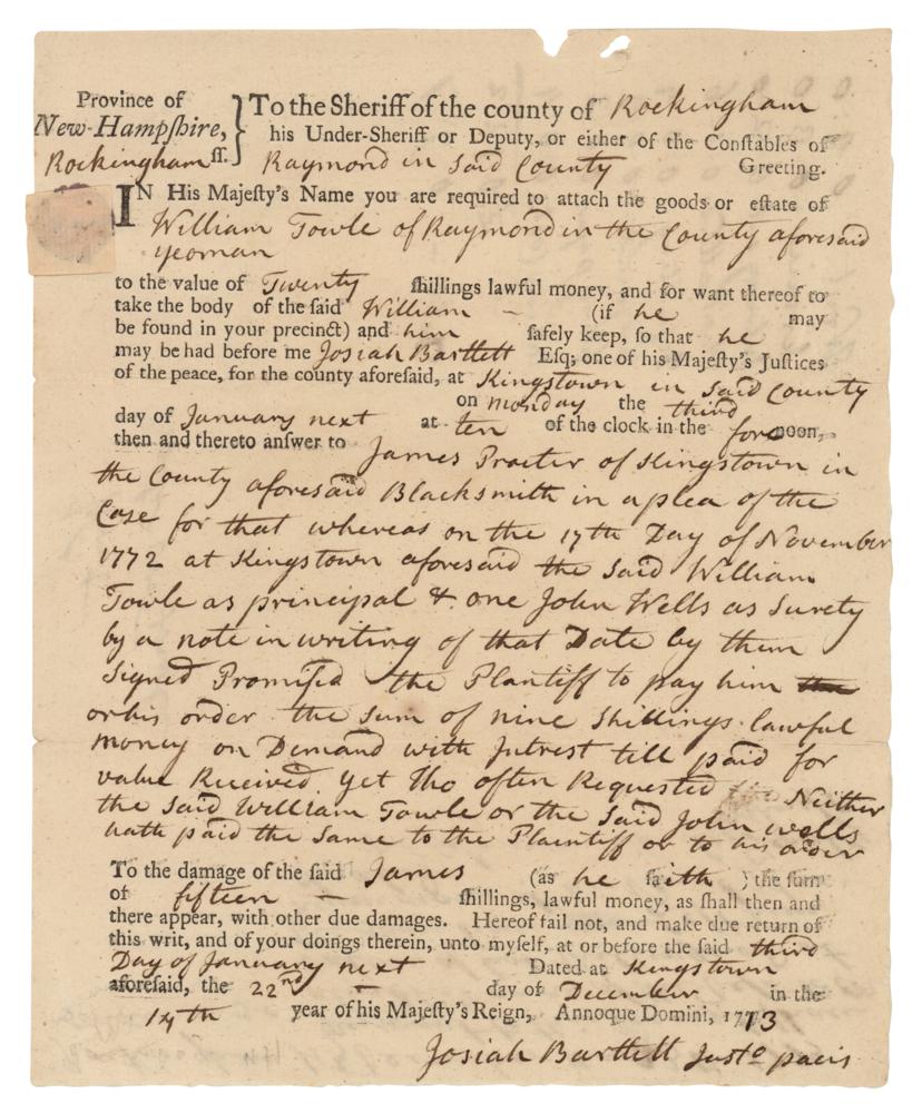 Physician and signer of the Declaration of Independence from New Hampshire (1729-1795) who served as that state's governor from 1790 to 1794. Partly-printed ADS, signed “Josiah Bartlett, Justo Pacis,” one page, 6.25 x 7.75, December 14, 1773. Document filled out and signed within the text by Bartlett, and signed again at the conclusion. In part: "To the Sheriff of the county of Rockingham...In His Majesty's Name you are required to attach the goods or estate of William Towle of Raymond...to the value of twenty shillings lawful money, and for want thereof to take the body of the said William (if he may be found in your precinct) and him safely keep, so that he may be had before me Josiah Bartlett Esq; one of his Majesty's Justices of the peace...and thereto answer to James Proctor of Kingstown in the County aforesaid Blacksmith in a plea." In fine condition, with trivial paper loss to the top edge.