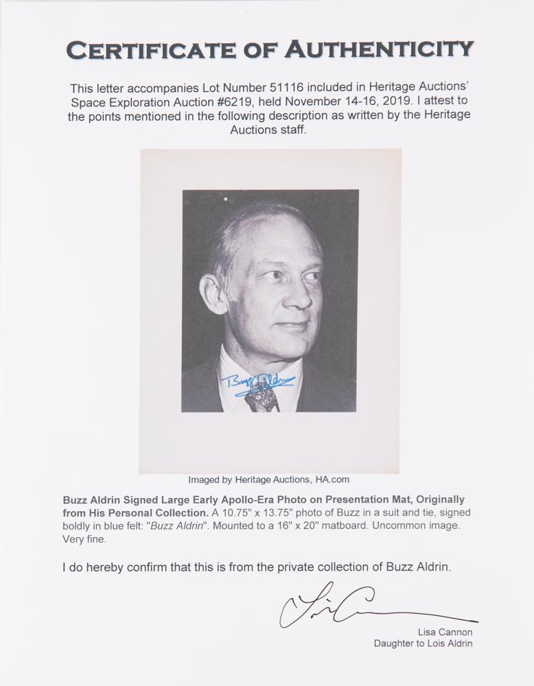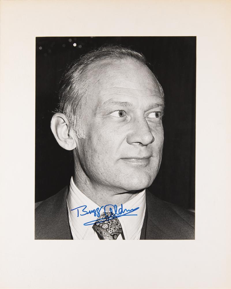 Oversized matte-finish 10.75 x 13.75 close-up photo of Buzz Aldrin in a suit and tie, affixed to its original 15.75 x 16.5 mount, prominently signed in blue felt tip. Reverse bears the credit stamp of photographer Bob Steele, annotated "12-16-76" below. In fine condition. Accompanied by a letter of provenance signed by Lois Cannon, daughter to Lois Aldrin, certifying that the photo is from the private collection of Buzz Aldrin.