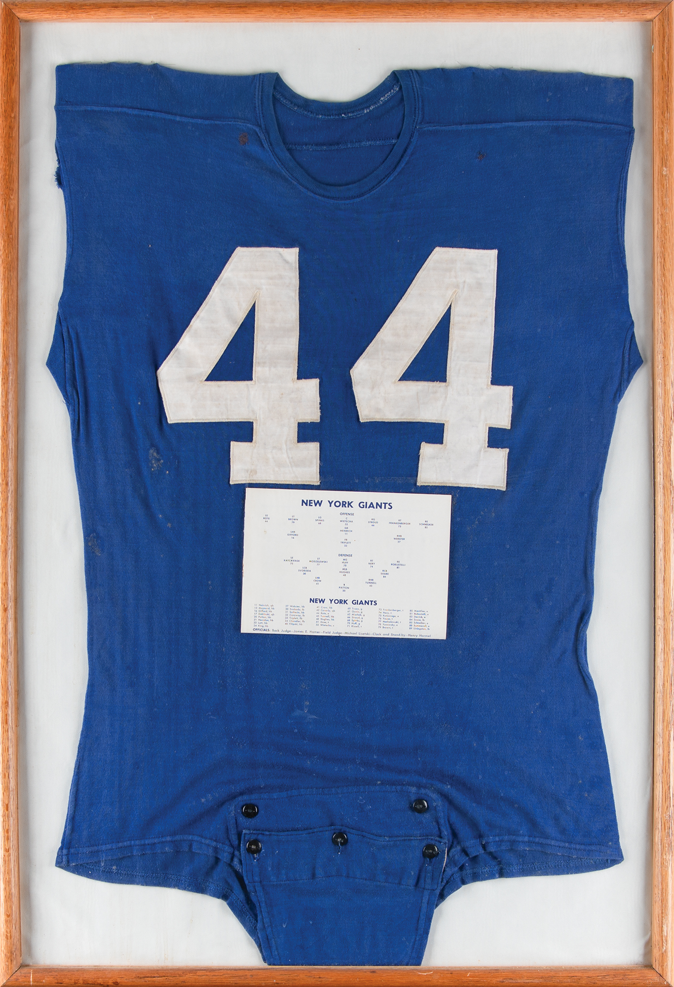 Original vintage circa 1950s Kyle Rote New York Giants football jersey, evidently game used based on wear, stains, style, and quality; the consignor notes that it originates from the estate of an athletic trainer who worked with several professional football players. The classic blue jersey features sewn-on white "44" patches on the front, and features an old-school button crotch. Mounted and framed with a page from a program showing the Giants' roster to an overall size of 25 x 37. In very good condition, with expected staining and wear to the jersey, and some fraying evident to the seam at the right arm.