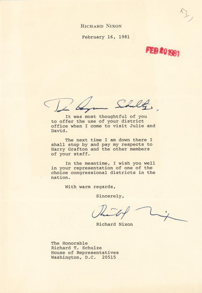 TLS, one page, 7.25 x 10.5, February 16, 1981. Letter to Congressman Dick Schulze, in part: "It was most thoughtful of you to offer the use of your district office when I come to visit Julie and David. The next time I am down there I shall stop by and pay my respects to Harry Grafton and the other members of your staff. In the meantime, I wish you well in your representation of one of the choice congressional districts in the nation." In fine condition, with light handling wear.