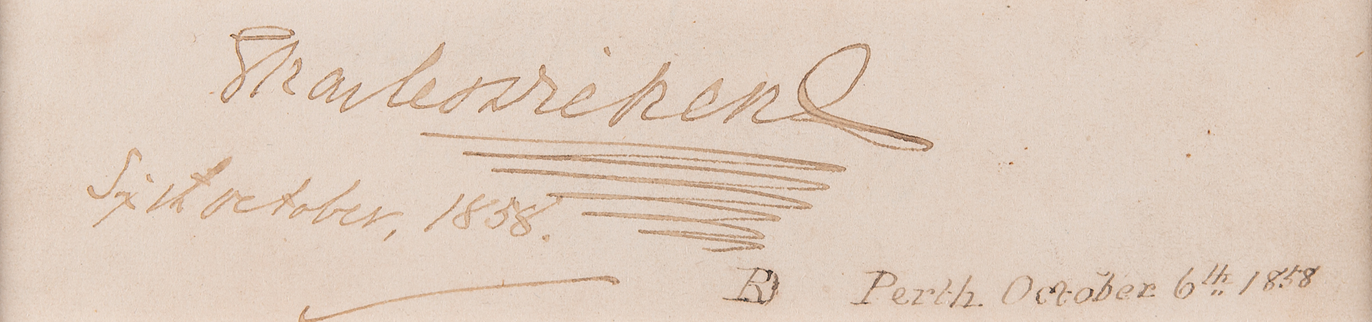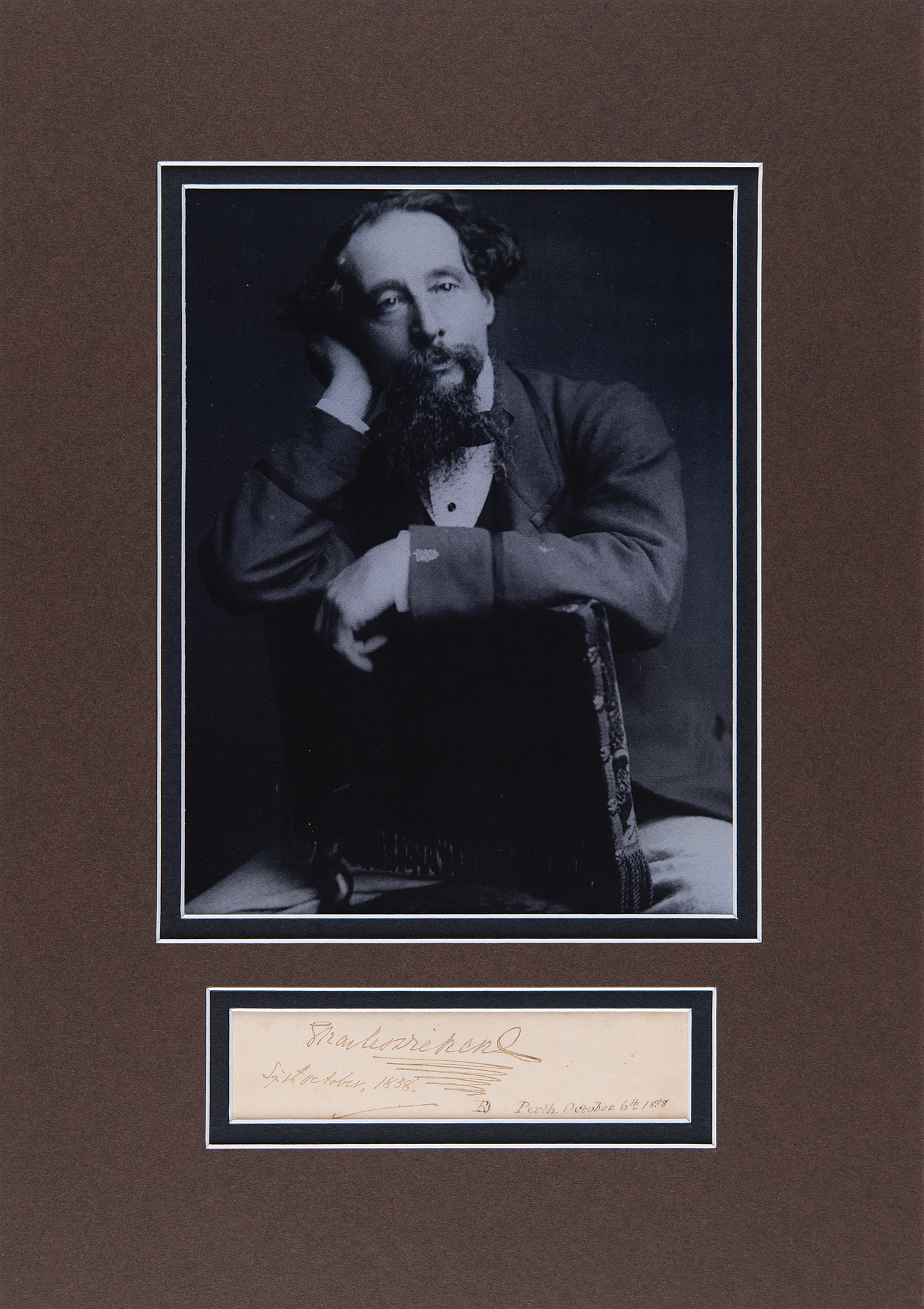 Ink signature, "Charles Dickens, Sixth October, 1858,” on an off-white 4.75 x 1 sheet, the lower right of which bears collector's notations placing the signature to Perth, Scotland. Double-matted with a portrait to an overall size of 9.75 x 13.75. In fine condition.