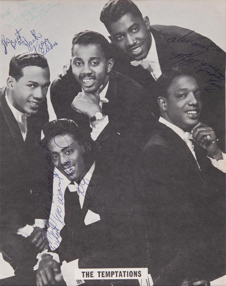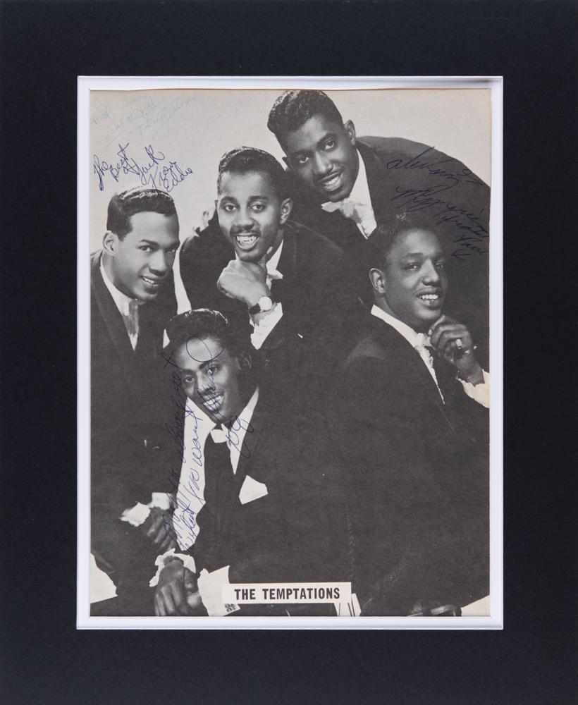Large vintage 8.75 x 11.75 program photo of The Temptations wearing handsome matching suits, signed in blue ballpoint, “May you always get what you want, David [Ruffin],” “The best of luck, from Eddie [Kendricks],” and “Always...from Paul [Williams],” and in green ballpoint, “Best wishes...Otis [Williams], Temptations.” Double-matted and in fine condition.