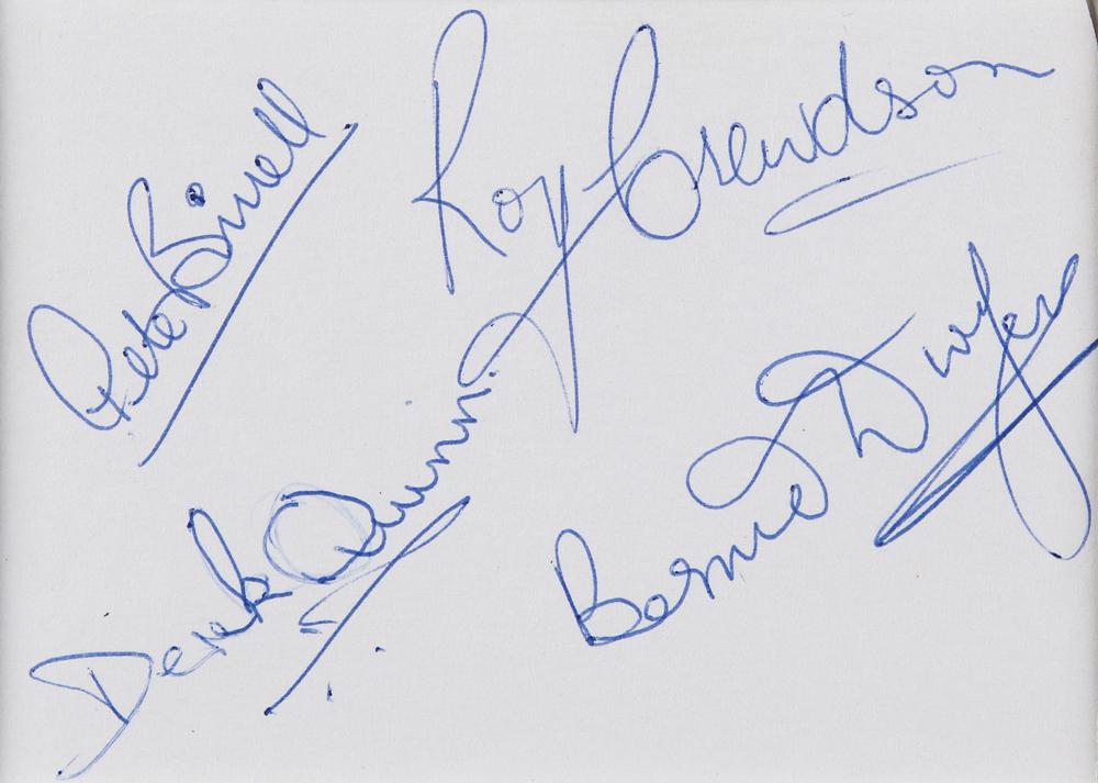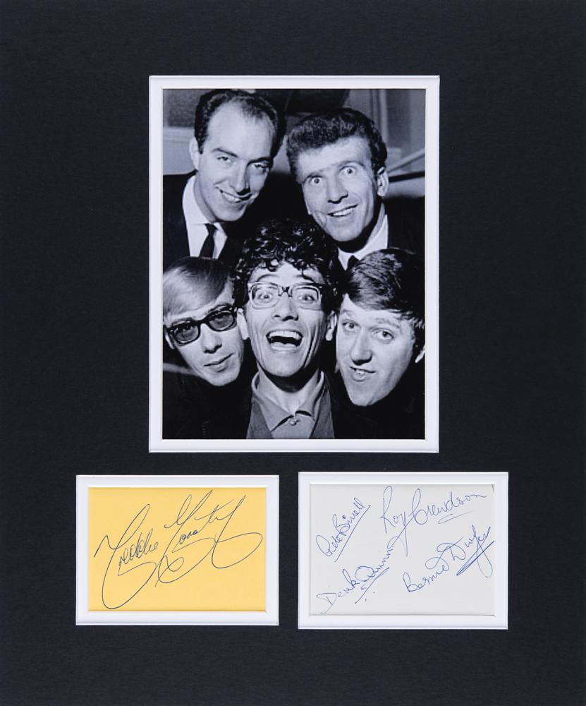 Vintage ballpoint signatures of Freddie and the Dreamers members Freddie Garrity, Roy Crewdson, Derek Quinn, Peter Birrell, and Bernie Dwyer on a pair of yellow and off-white 3.75 x 2.75 album pages. Double-matted together with a photo of the band to an overall size of 13 x 15.5. Includes a second signature of Freddie Garrity (ins) on a pink 3.75 x 3 sheet affixed to a same-size cardstock mount. In overall fine condition. Accompanied by five photos related to the band and its musicians, with a couple bearing facsimile signatures.