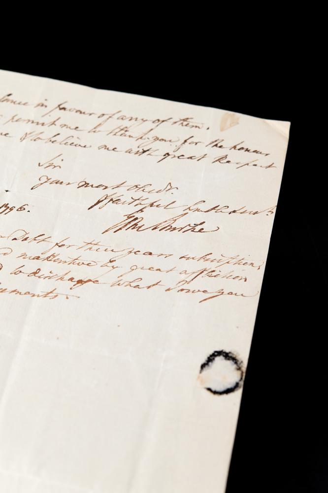 Burke adds a postscript: “I believe I am in your debt for three years subscription, but I have been rendered inattentive by great affliction I shall write to a friend to discharge what I owe you with my best acknowledgments.” Peltier indeed published his translation of this book in London in 1797. In fine condition. An amusing and gracious letter from Burke to his translator, heaping praise on the latter’s adept balance of the English and French languages in regard to Burke’s noteworthy and often scathing reply to the Dukes of Bedford and Lauderdale, men who criticized Burke’s reception of a hefty pension, one awarded from the throne.
