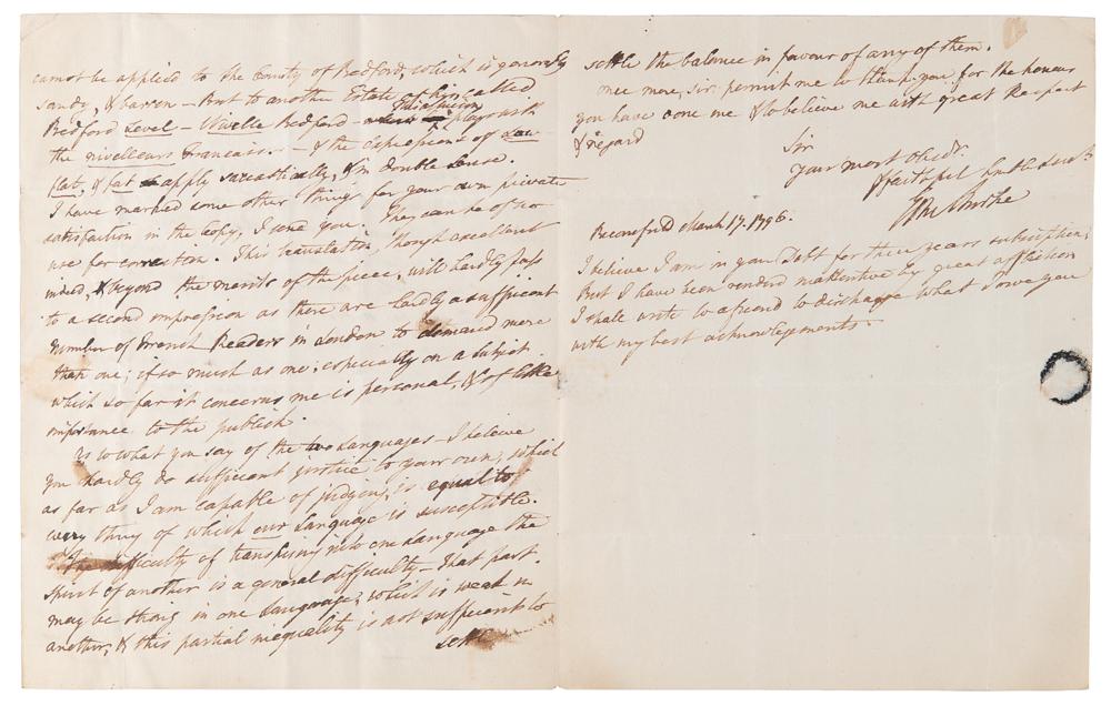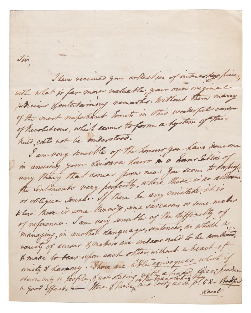 ALS signed “Edm. Burke,” three pages on two adjoining sheets, 7.5 x 9.5, March 17, 1796. Addressed from Beaconsfield, an interesting handwritten letter from Edmund Burke to Jean-Gabriel Peltier, the French translator of his famous work, ‘A Letter From the Right Honourable Edmund Burke to a Noble Lord: On the Attacks Made Upon Him and His Pension, in the House of Lords by the Duke of Bedford and the Earl of Lauderdale, Early in the Present Sessions of Parliament,’ one of his last significant works written in 1796, one year before his death. In this letter, Burke suggests some corrections and compares the possibilities of English vs French for expressing his ideas and style.