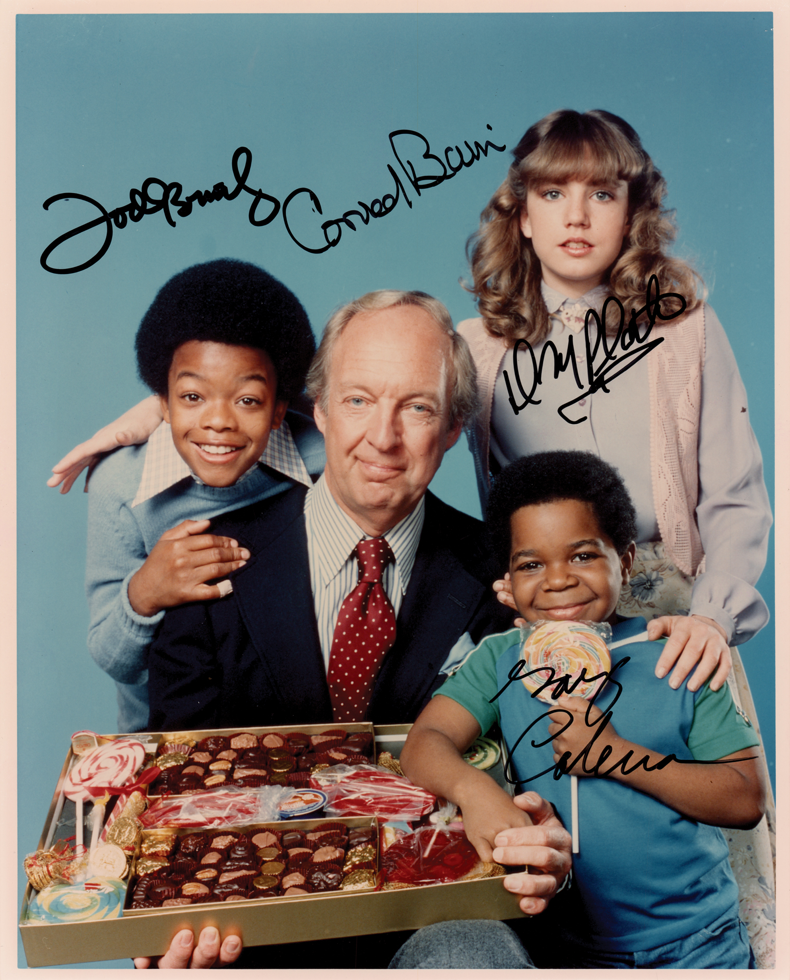 Color glossy 8 x 10 photo of the four stars of Diff'rent Strokes, signed in black felt tip by Gary Coleman, Dana Plato, Todd Bridges, and Conrad Bain. In fine condition.