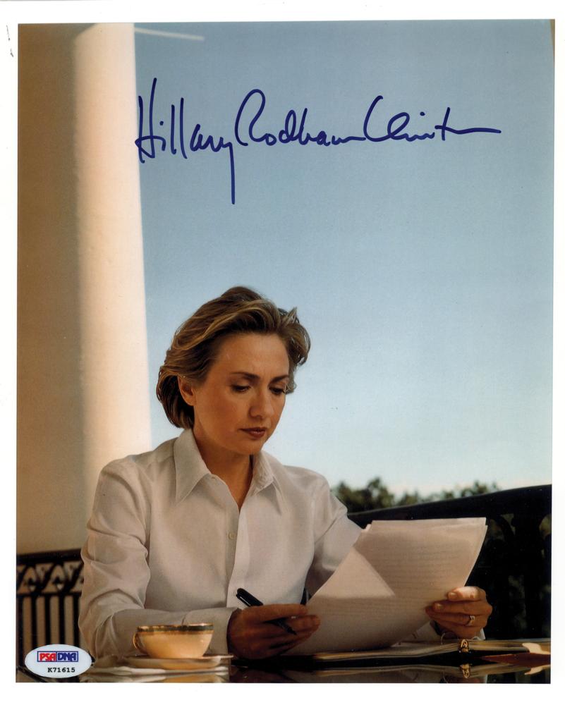 Color glossy 8.5 x 10.75 photo of First Lady Hillary Clinton working on the South Portico of the White House, signed in blue felt tip, "Hillary Rodham Clinton." In very fine condition, with a PSA/DNA label affixed to the lower corner. Accompanied by a certificate of authenticity from PSA/DNA.