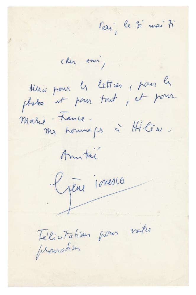 Distinguished Romanian-born playwright (1909-1994) best known as a leading figure in the 'Theatre of the Absurd.' ALS in French, signed “Gene Ionesco,” one page, 5.25 x 8.25, May 31, 1971. Addressed from Paris, a handwritten letter to a friend, in part (translated): “Thank you for the letters, for the photos and for everything, and for Marie-France.” Ionesco adds a short postscript: “Congratulations on your promotion.” In very good to fine condition, with overall creasing.