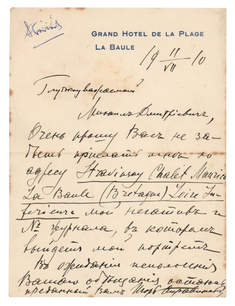 Very early ALS in Russian, one page, 5 x 6.75, Grand Hotel de la Plage, La Baule letterhead, July 11, 1910. Handwritten letter to Mikhail Dmitrievich, in part (translated): “I beg you not to forget to send me at Stravinsky Chalet, Mauricette La Baule (Brittany) ...my negatives and the issue of the magazine in which my portrait will be published. In anticipation of the fulfillment of your promise, I remain devoted to you.” In fine condition, with scattered light foxing. An exceptionally early letter from Igor Stravinsky penned just days after the first performance of The Firebird, which premiered on June 25, 1910, and became an immediate success, catapulting Stravinsky to international fame. A fabulous early example capturing the Russian composer at a turning point in his career.