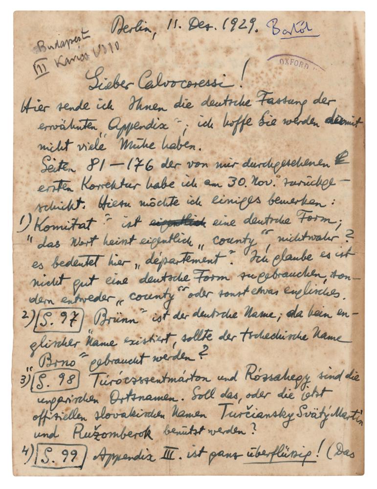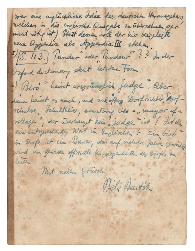Hungarian-born musician (1881-1945) who, through his far-reaching endeavors as composer, performer, educator, and ethnomusicologist, emerged as one of the most forceful and influential creative personalities of the 20th century. ALS in German, one page both sides, 5.75 x 7.5, December 11, 1929. Addressed from Berlin, an untranslated handwritten letter from Bela Bartok to his translator Michel Dimitri Calvocoressi. In very good to fine condition, with a thin strip of edge toning, and heavy overall foxing.