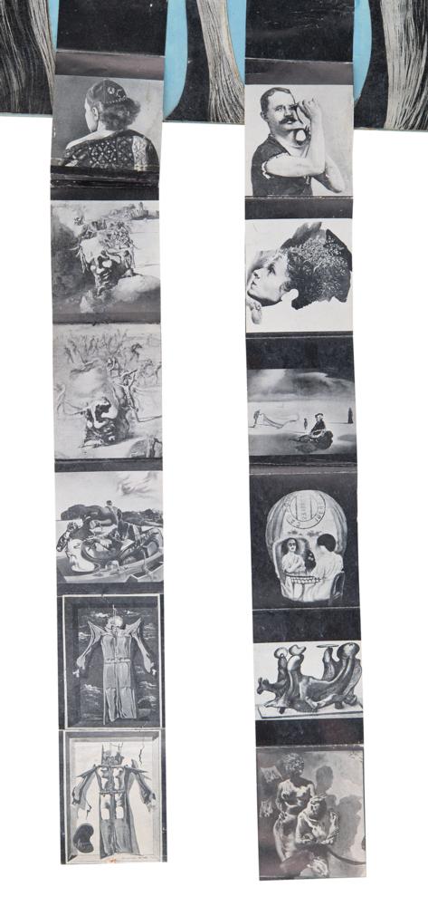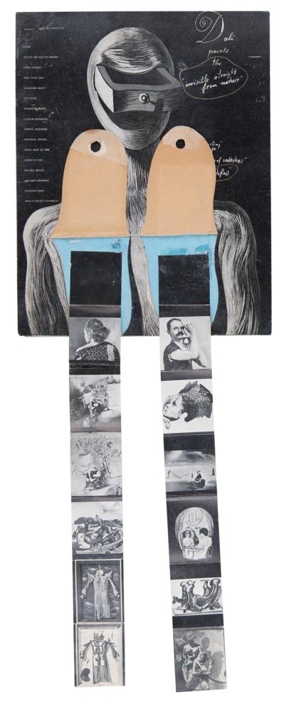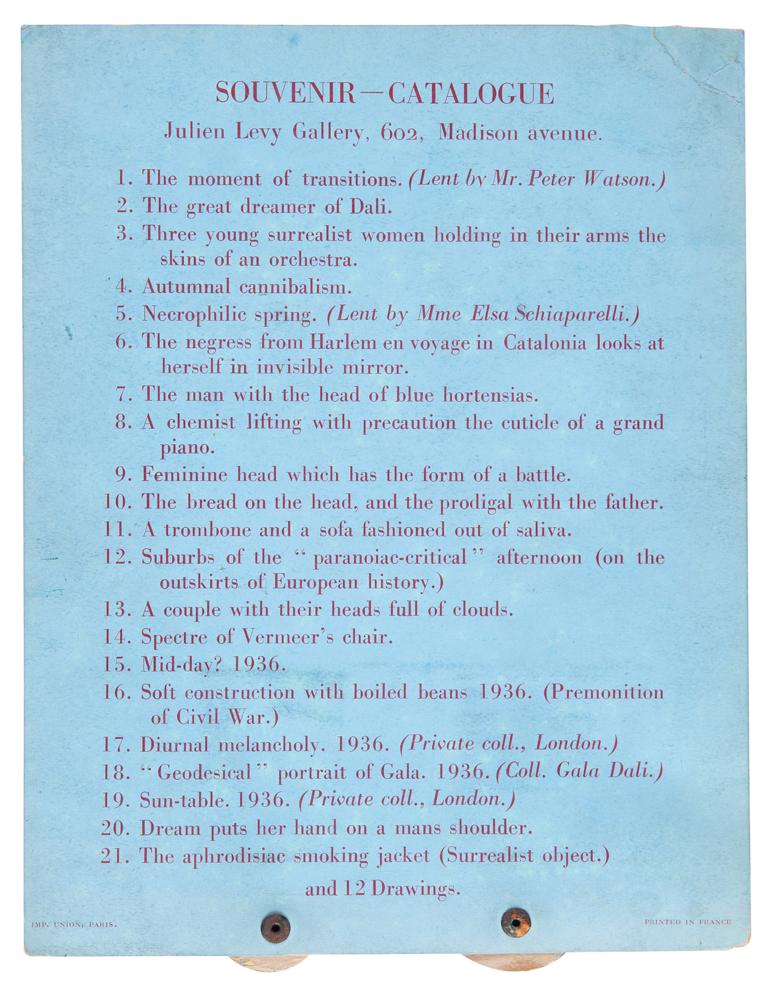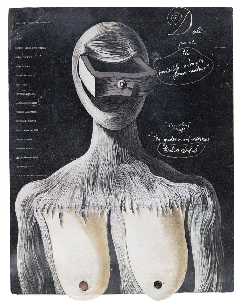 Rare original program designed by Salvador Dali for his exhibition ‘Dalí paints the ‘invisible straight from nature,’ which was held at the Julien Levy Gallery in New York, from December 15, 1936, to January 15, 1937. The cardstock program, 7.75 x 10, features the image of a white-haired figure with an open drawer where the face might be and hairless breast compartments that hang below the bottom edge of the page, with brass snaps that open to release accordion-folded strips, each with six reproductions of Dali works. Text to right side promises “Disturbing images,” “The epidermis of orchestras,” and "Saliva sofas,” and the reverse lists 21 works in the exhibition, including “The moment of transitions,” “Autumnal cannibalism,” “Spectre of Vermeer’s chair,” and more. In very good to fine condition, with light warping and corner creasing, and one of the nipple snaps missing.