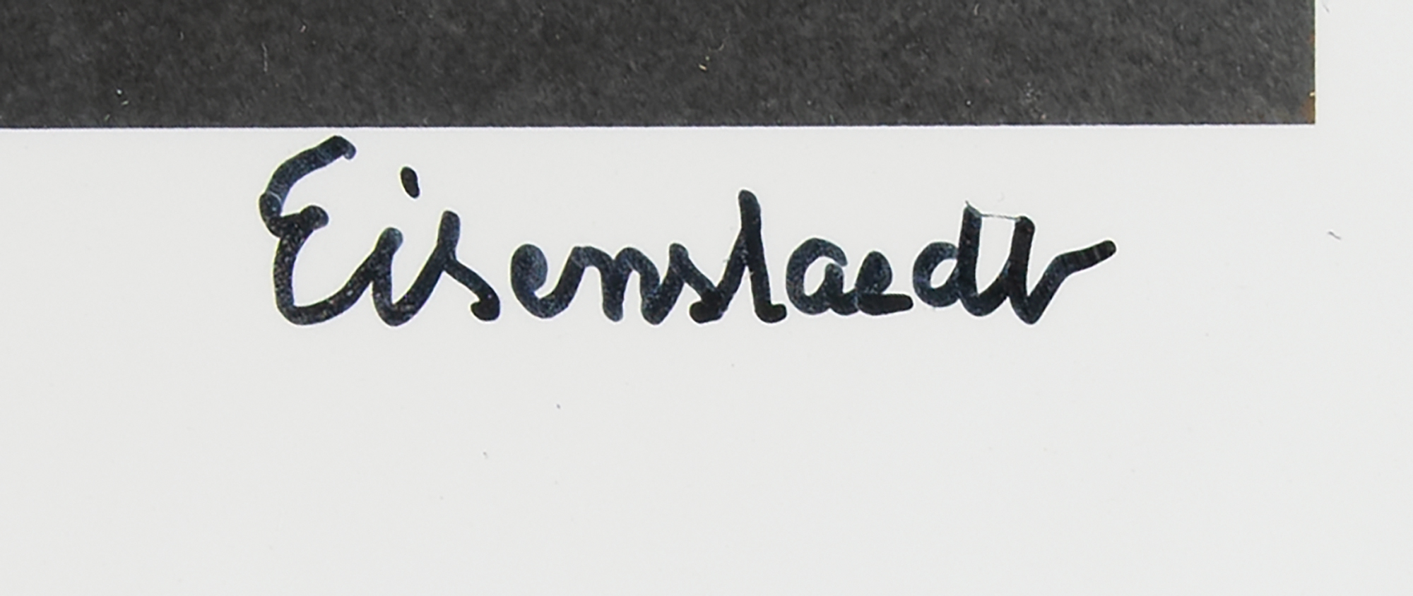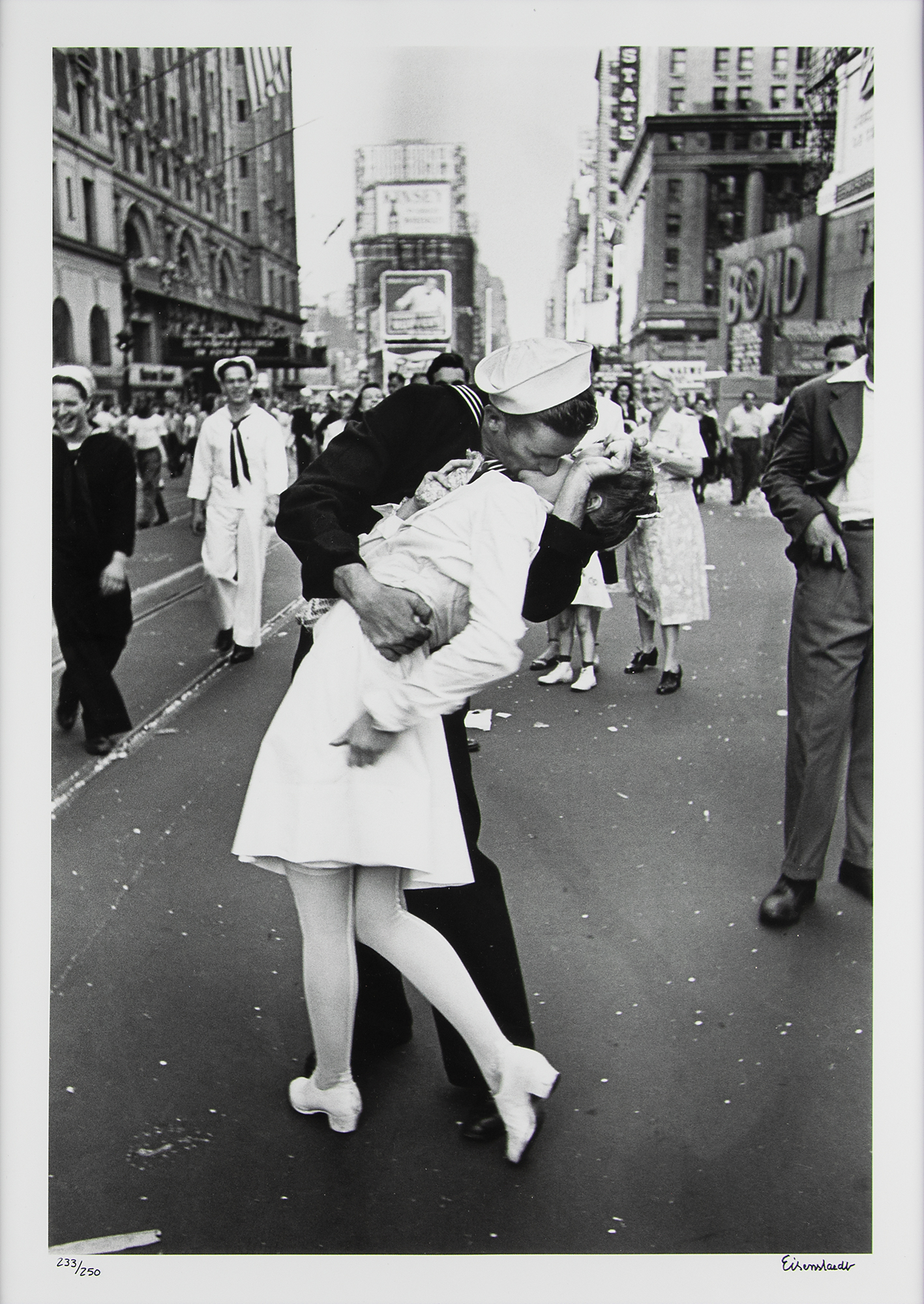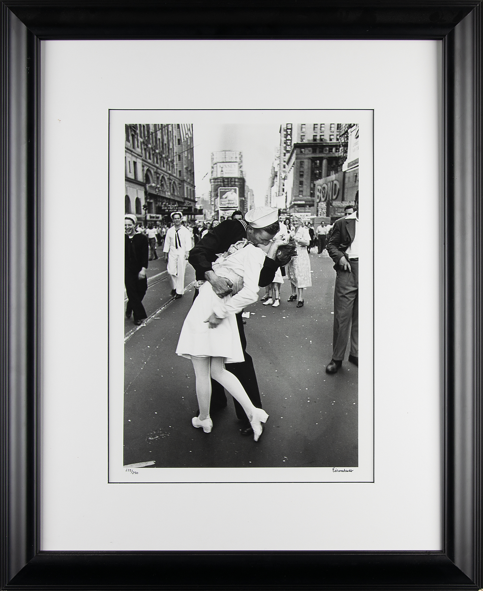 Marvelous limited edition 13.5 x 19 silver gelatin print of Alfred Eisenstaedt's iconic photograph entitled 'V-J Day in Times Square,' numbered 233/250, signed in the lower border in black felt tip by the photographer, "Eisenstaedt." Annotated on the reverse in another hand in pencil: "Print made in Time Life photo lab, 1994, V-J Day, Times Square, New York City, 1945 by Alfred Eisenstaedt." Handsomely matted and framed to an overall size of 25 x 30. In very fine condition.