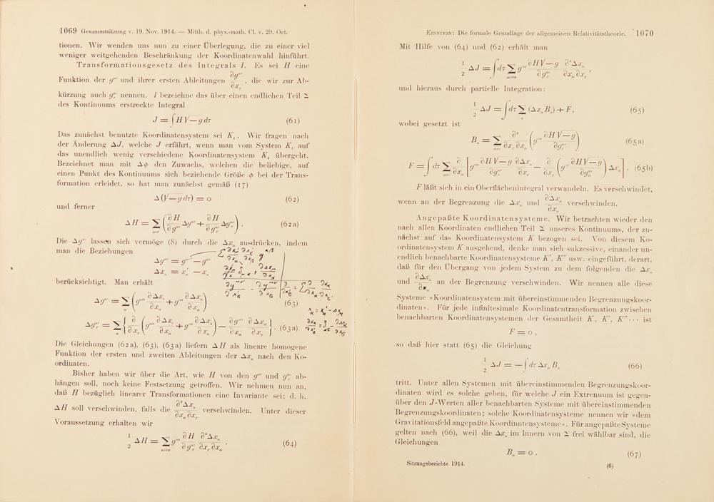 Author’s presentation offprint of "Die formale Grundlage der allgemeinen Relativitätstheorie [The Formal Basis of the General Theory of Relativity]" from Sitzungsberichte der Königlich Preussischen Akademie der Wissenschaften, XLI, 19 November 1914. Berlin: Königlichen Akademie der Wissenschaften. 1914. Gr.-8vo. S. 1030-85. Bound in the original printed wrappers, 7 x 10, inscribed in Einstein's hand, "Mit aller Hochachtung [With all respect]," over the imprinted text, "Überreicht vom Verfasser [Submitted by the Author]." On page 1069, Einstein adds a lengthy formula in his hand, and on page 1072 he writes: "Hier ist benutzt, dass auch das System K 2 dem invarianten [oder: unvariiertem] Felde angepasst ist [Here it is used that the system K 2 is also adapted to the invariant [or: unvarying] field]." In fine condition, with a light central vertical fold, and soiling and handling wear to the covers. Accompanied by a letter of authentication from Viennese Antiquarian Book Dealer Ingo Nebehay, 1982.