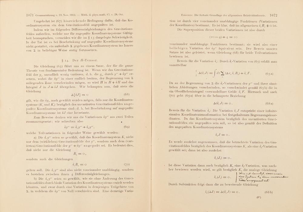 “In summer 1914, Einstein felt that the new theory should be presented in a comprehensive review. He also felt that a mathematical derivation of the field equations that would determine them uniquely was still missing. Both tasks are addressed in a long paper, presented in October 1914 to the Prussian Academy for publication in its Sitzungsberichte. It is entitled ‘The formal foundation of the general theory of relativity’; here, for the first time, Einstein gave the new theory of relativity the epithet ‘general’ in lieu of the more cautious 'generalized' that he had used for the Entwurf” (Landmark Writings in Western Mathematics 1640-1940). “In the year that he was called to Berlin, on October 29, 1914, Einstein was able to present his work “Die formale Grundlage der allgemeinen Relativitätstheorie”...The “formal foundation” of the general theory of relativity was the tensor calculus. Without the tensor calculus, the general theory of relativity could not have been formulated...By October 1914, Einstein was finally able to present his results in mathematical form, and indeed in a manner that became the basis of his general theory of relativity of 1916. He introduced general covariants, contravariants, and also—what was new—mixed tensors, in order to represent the individual arithmetic operations, above all, the various types of multiplication. Thus the mathematical calculus necessary for the general theory of relativity was at the ready in 1914” (Reich). “The principal novelty [in the present paper] lies in the mathematical formulation of the theory. Drawing on earlier work with [Marcel] Grossman, Einstein formulated his gravitational field equations using a variation principle” (Calaprice, 47).