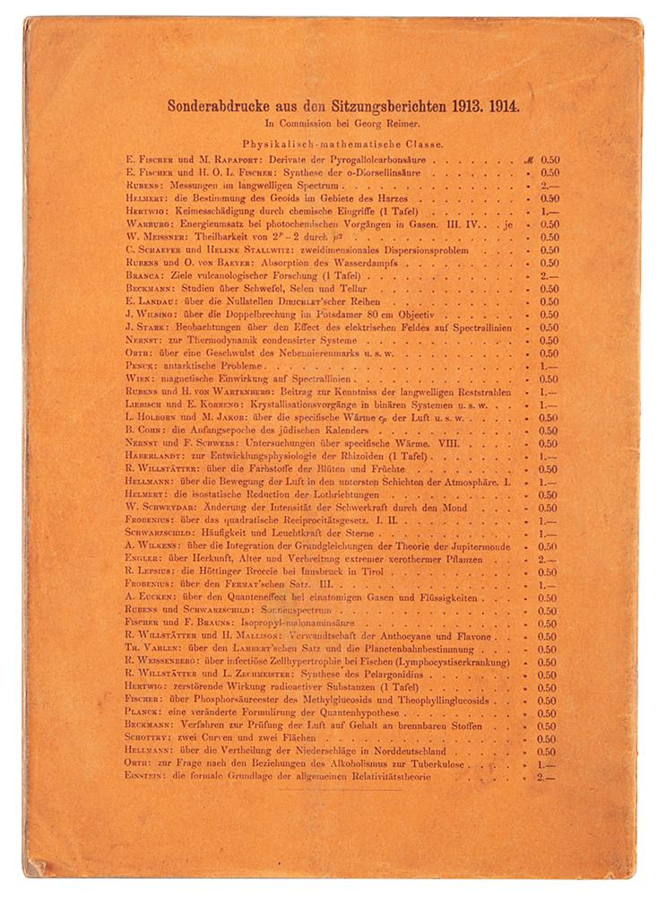 Until about 1916, most of Einstein’s papers were published in Annalen der Physik; from 1916 until he left Germany for the United States in 1933, most were published in the Berlin Sitzungsberichte. The Sitzungsberichte differed from other journals in which Einstein published in that it made separate printings of its papers commercially available. These separate printings have ‘Sonderabdruck’ printed on the front wrapper, the usual German term for offprint, but they are not offprints according to our definition. They were available to anyone; indeed a price list of these ‘trade offprints’ is printed on the rear wrapper. True author’s presentation offprints can be distinguished from these trade offprints by the presence of ‘Überreicht vom Verfasser’ on the front wrapper.