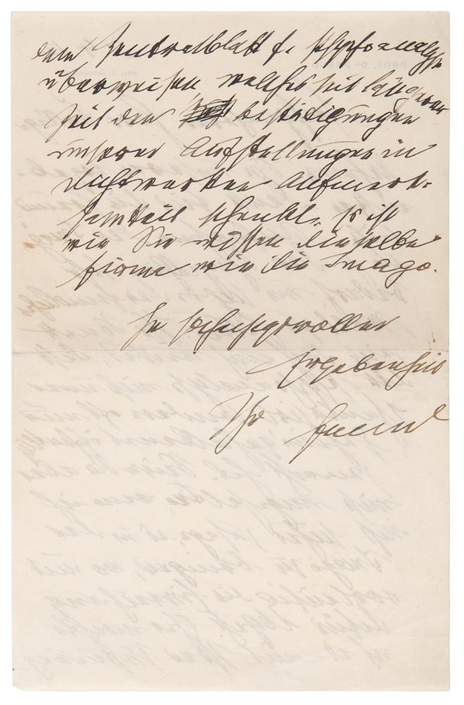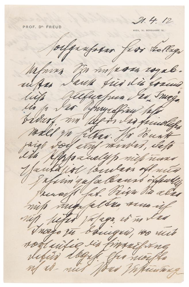 ALS in German, signed “Freud,” one page both sides, 5.25 x 8.25, personal "Prof. Dr. Freud" letterhead, April 21, 1912. Handwritten letter to the medical doctor, writer and poet Hugo Salus, in part (translated): "Accept our most sincere thanks for the kind reception of 'Imago,' which indeed requires sympathy to sustain itself in the hostile world. Your sonnet also once again shows that psychoanalysis does not always fantasize but often only discloses what was kept secret. However, please do not be displeased if I do not firmly commit to publishing it in Imago, where we currently lack the space for it. Rather, with your consent, I would prefer to transfer it to the Zentralblatt für Psychoanalyse, which has been paying attention to confirmations of our propositions in poetic works for some time. As you know, it is the same publisher as Imago." In fine condition, with a short split to the central horizontal fold. Accompanied by an export certificate from the French Ministry of Culture. A significant letter by Dr. Freud, acknowledging the adoption of his psychoanalytic practices by members of the arts community. In 1912, Salus's sonnet 'Der Knabe' appeared in No. 12 of the Zentralblatt für Psychanalyse und Psychotherapie, a publication co-edited by Sigmund Freud.
