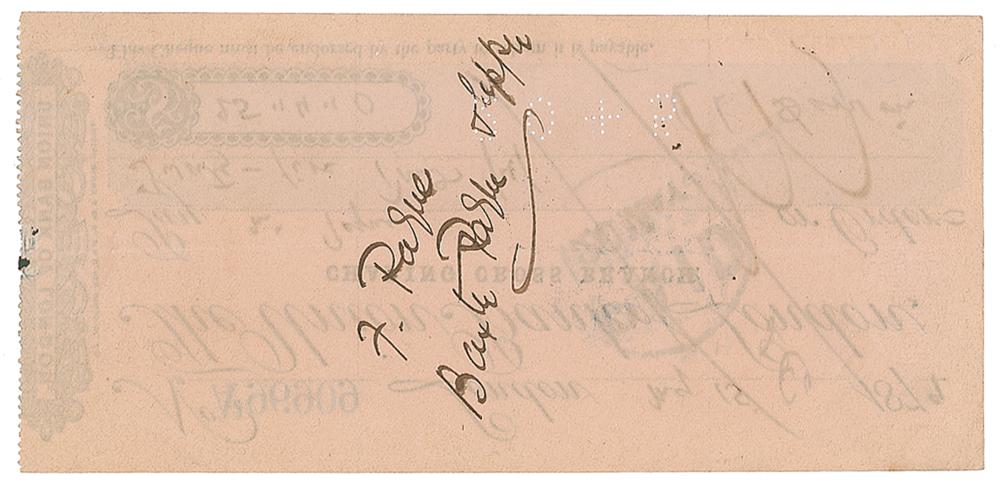Union Bank of London check, 7 x 3.25, filled out and signed by Darwin, "Ch. Darwin," payable to Mr. Payne for £25.4.0, May 15, 1879. Stamped "Paid" on May 20th. In fine condition. A tremendously scarce and sought-after format, this is just the second Darwin check we have ever offered.