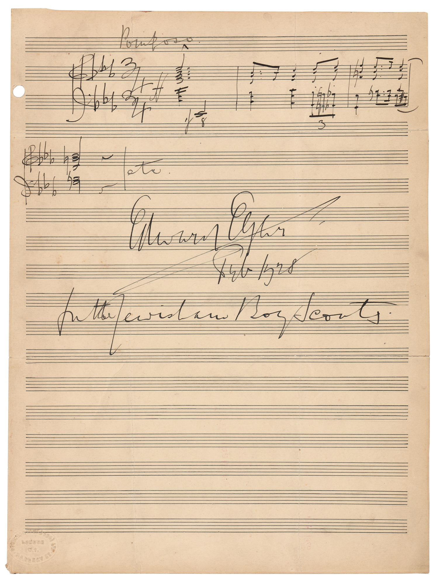 Impressive AMQS from Edward Elgar on an off-white 8.5 x 11.5 musically lined sheet, which is signed and inscribed below in fountain pen, “Edward Elgar, Feb 1928, for the Lewiston Boy Scouts.” Elgar adds six bars of music to the upper portion, which bears a “Pomposo" marking. In fine condition, with a single file hole to the left edge.