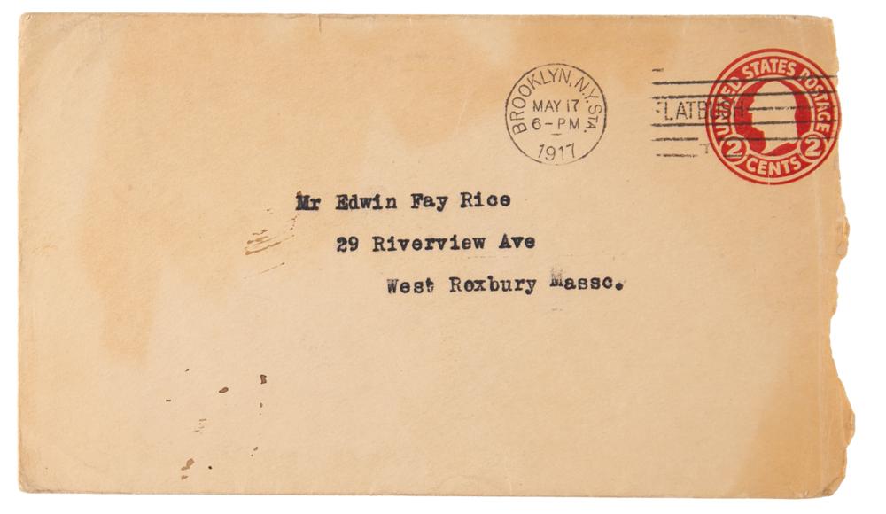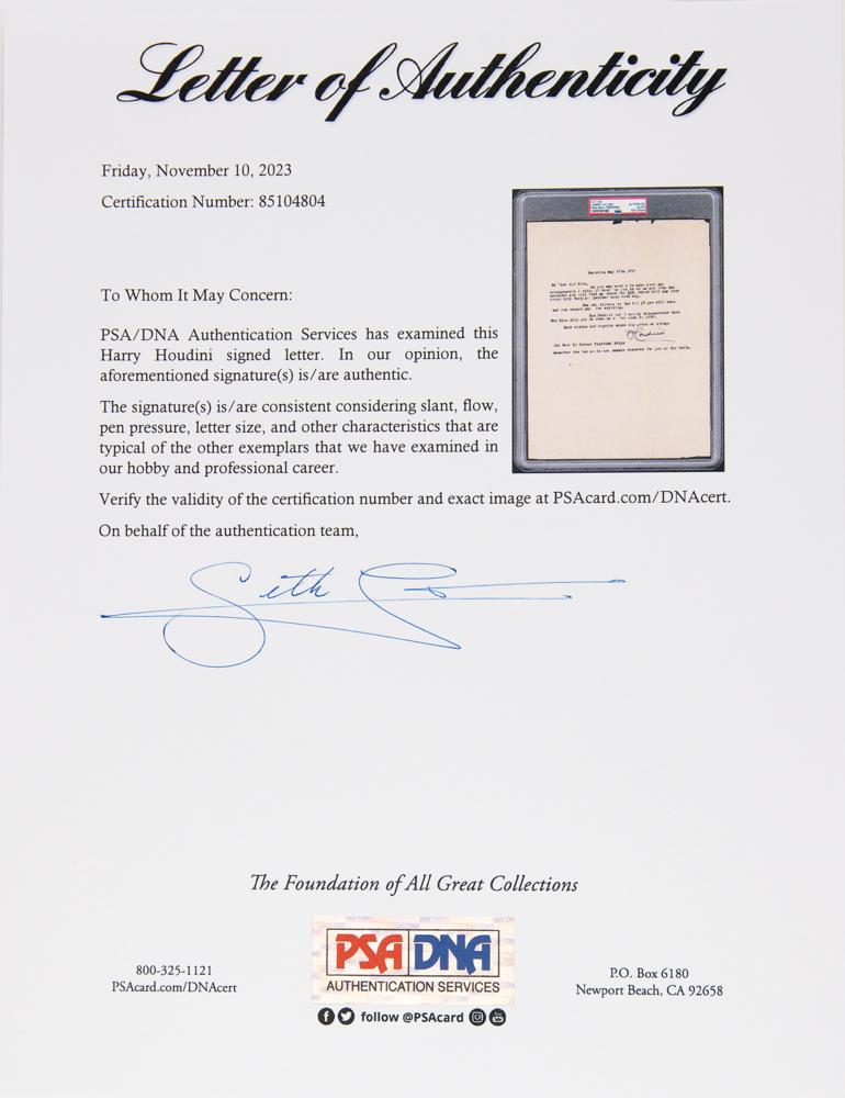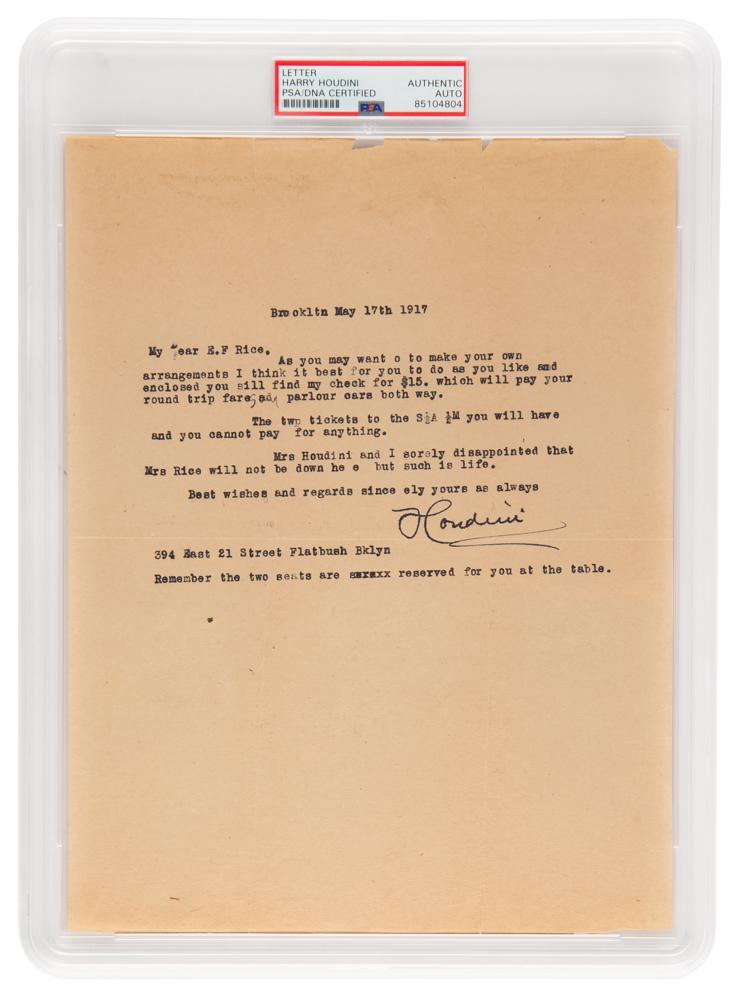 TLS signed “Houdini,” one page, 8.5 x 11, May 17, 1917. Letter to Boston-area magician Edwin Fay Rice, in part: "As you may want to make your own arrangements I think it best for you to do as you like and enclosed you will find my check for $15. which will pay your round trip fares, parlour cars both ways...Mrs. Houdini and I sorely disappointed that Mrs. Rice will not be down here but such is life." In fine condition, with some minor chipping to the top edge. Encapsulated in a PSA/DNA authentication holder. Accompanied by the original mailing envelope and a full letter of authenticity from PSA/DNA. A journalist for the Boston Daily Times, Edwin Fay Rice had a short but impactful career in the world of magic, and was a key figure in helping found the Mystics Circle of Boston as a member of the Society of American Magicians.